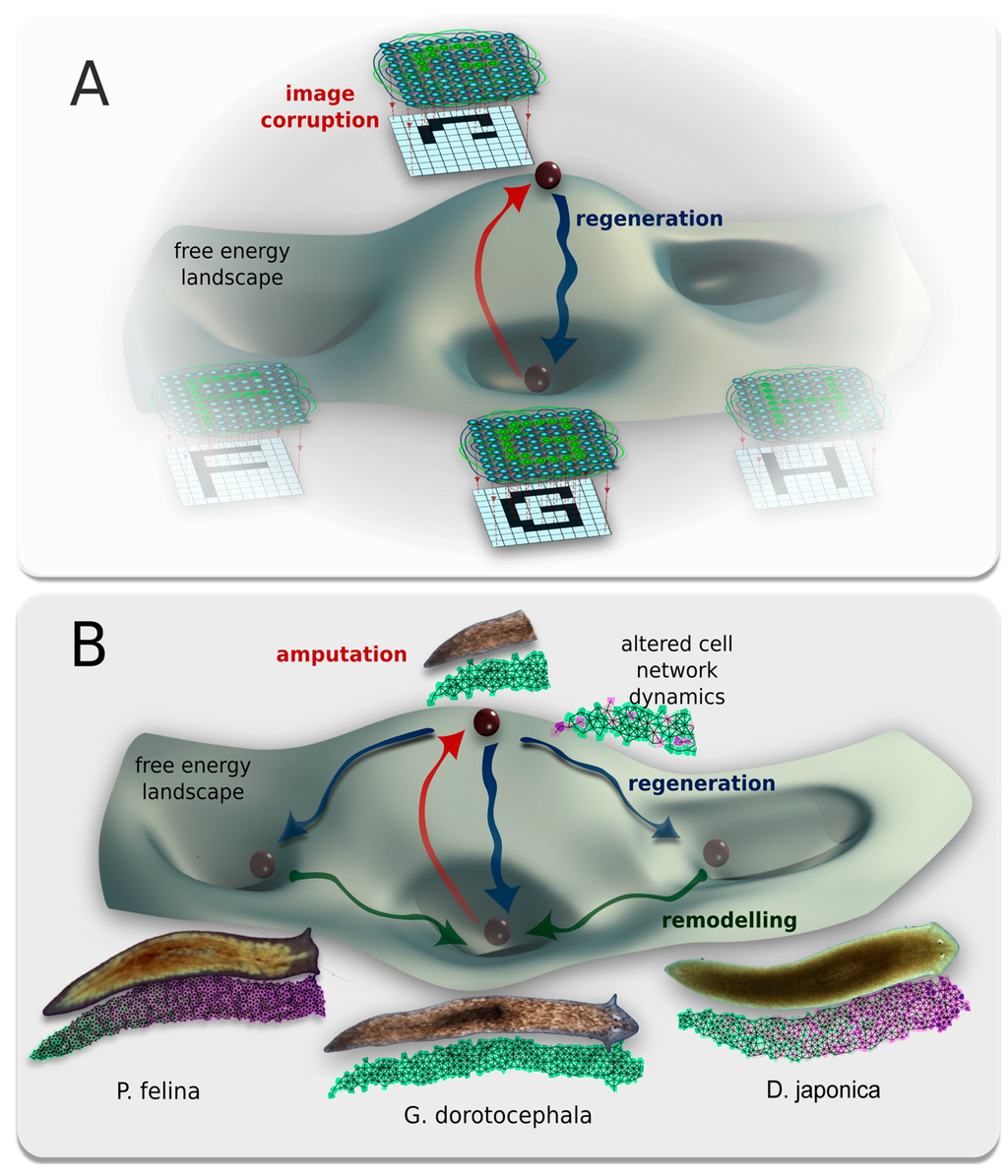 A conceptual model of shape change driven by physiological network dynamics. Planaria regeneration parallels classical neural network behavior; both can be described in terms of free energy landscapes with multiple attractor states. (A) Behavior of a classical Hopfield neural network trained to reproduce three types of patterns, in this case shapes of the letters “F”, “H”, or “G”, which are the three stable states of the network’s free energy landscape. The state of the Hopfield network’s nodes directly relate to the brightness of pixels on a display, generating output. Perturbation of the network from a stable state (red arrow) by deleting (damaging) part of the pattern is akin to moving a ball to an unstable point on the free energy landscape, and leads to regeneration of the closest learned attractor state (blue arrow). In this, such networks’ well-known ability to implement memory is analogous to regenerating organisms restoring a specific target morphology upon damage; (B) The parallel concept of planaria regeneration into head shapes of one of three different species, which are attractor states of the free energy landscape. Outcome morphology is driven by the dynamic outputs of physiological cellular network. Amputation (red arrow) is akin to moving the system to an unstable point on the free energy landscape. Normal regeneration would return the system to its main attractor, but altering cell network dynamics via gap junction blockade allows for regenerative transitions (blue arrow) to alternative local minima, corresponding to morphospace regions normally occupied by P. felina and S. mediterranea worms. In time, remodeling (green arrow) transfers these morphologies to the global minimum of the wild-type state (G. dorotocephala).
