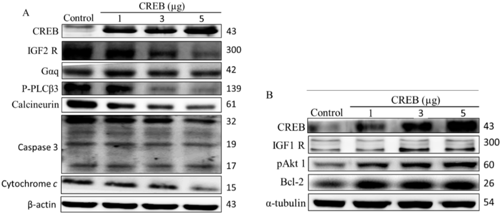 Previous studies have shown that the anti-apoptotic effect of IGF-I require activation of the transcription factor CREB and subsequent expression of bcl-2 []. Therefore, we further characterized the IGF1R and IGF2R pathway-related protein expression in H9c2 cardiomyoblast cells after 24 h of CREB transfection (Figure 1A,B). The levels of IGF2R pathway-related IGF2R, Gαq, p-PLCβ3, calcineurin, caspase-3, and cytochrome-C protein expression were significantly decreased in H9c2 cardiomyoblast cells after transfection with CREB in a dose-dependent manner (Figure 1A). The expression of IGF1R pathway-related proteins IGF1R, p-AKT, and Bcl-2 increased with the transfection of increasing doses of CREB (Figure 1B). These findings suggest that CREB overexpression not only repressed the IGF2R-induced apoptosis pathway but also improved cell survival by activating the anti-apoptotic factor Bcl-2 in H9c2 cardiomyoblast cells.
