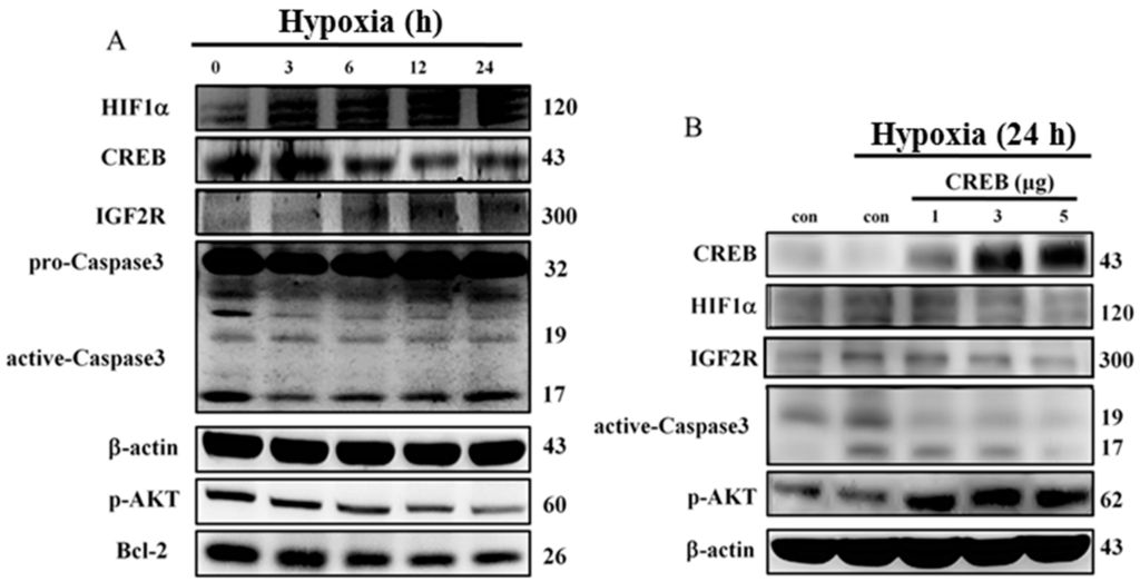 To investigate the molecular mechanisms that regulate the hypoxia-induced anti-apoptotic effect of CREB, we first confirmed that cell damage was induced by hypoxia. After 24 h of hypoxia exposure, the expression levels of hypoxia-induced factors, cell apoptosis proteins, and cell survival proteins in H9c2 cardiomyoblast cell were detected by Western blotting. The protein levels of HIF1α, IGF2R, p-IGF2R, and caspase-3 were elevated in a time-dependent manner, but the levels of CREB, p-AKT, and bcl-2 were reduced when the cells were exposed to hypoxia (Figure 2A). These data imply that CREB expression is repressed by hypoxia and that hypoxia induces mitochondrial-dependent cell apoptosis. Further transfection with CREB plasmids resulted in a dose-depended reversion in the hypoxia-induced reduction of p-AKT signaling in H9c2 cardiomyoblasts. In addition, the increased expression of the apoptosis proteins HIF1α, IGF2R, and caspase-3 proteins induced by hypoxia was attenuated following transfection with different doses of CREB (Figure 2B).