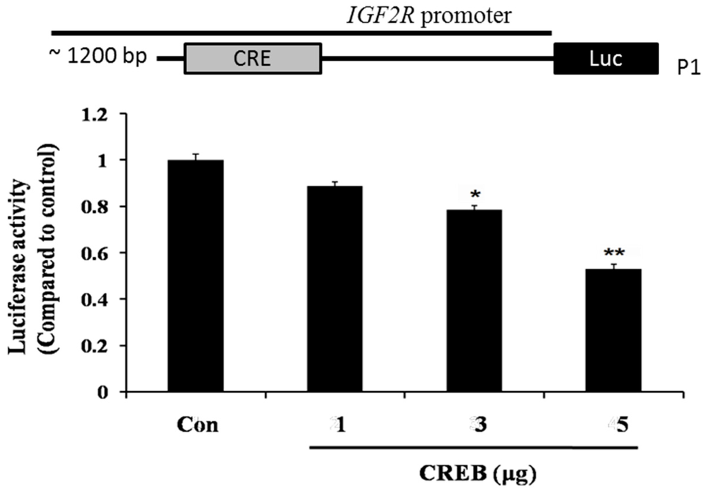 2.4. CREB Suppresses IGF2R Expression by Negatively Regulating the IGF2R Promoter Activity