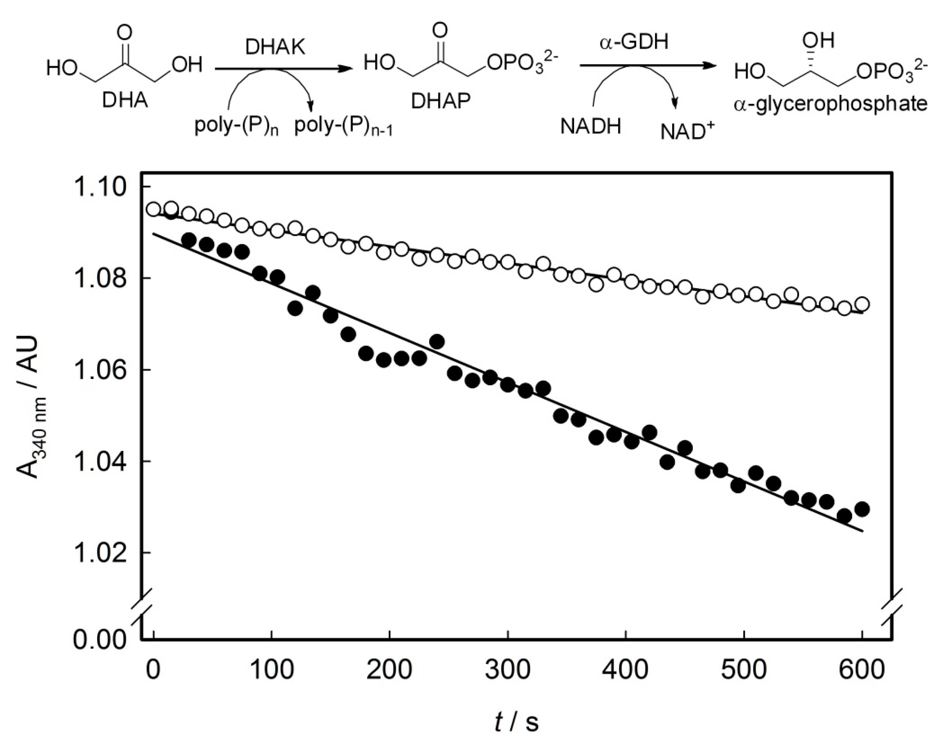 Enzymatic assay used to evaluate the poly-P-dependent kinase activity in the DHAK mutant library and time-dependent decrease of NADH absorbance at 340 nm corresponding to the mutant 3E4. (○) Unspecific NADH oxidation measured in absence of DHA and (●) slope obtained in presence of DHA. For details, see Section 3.6.