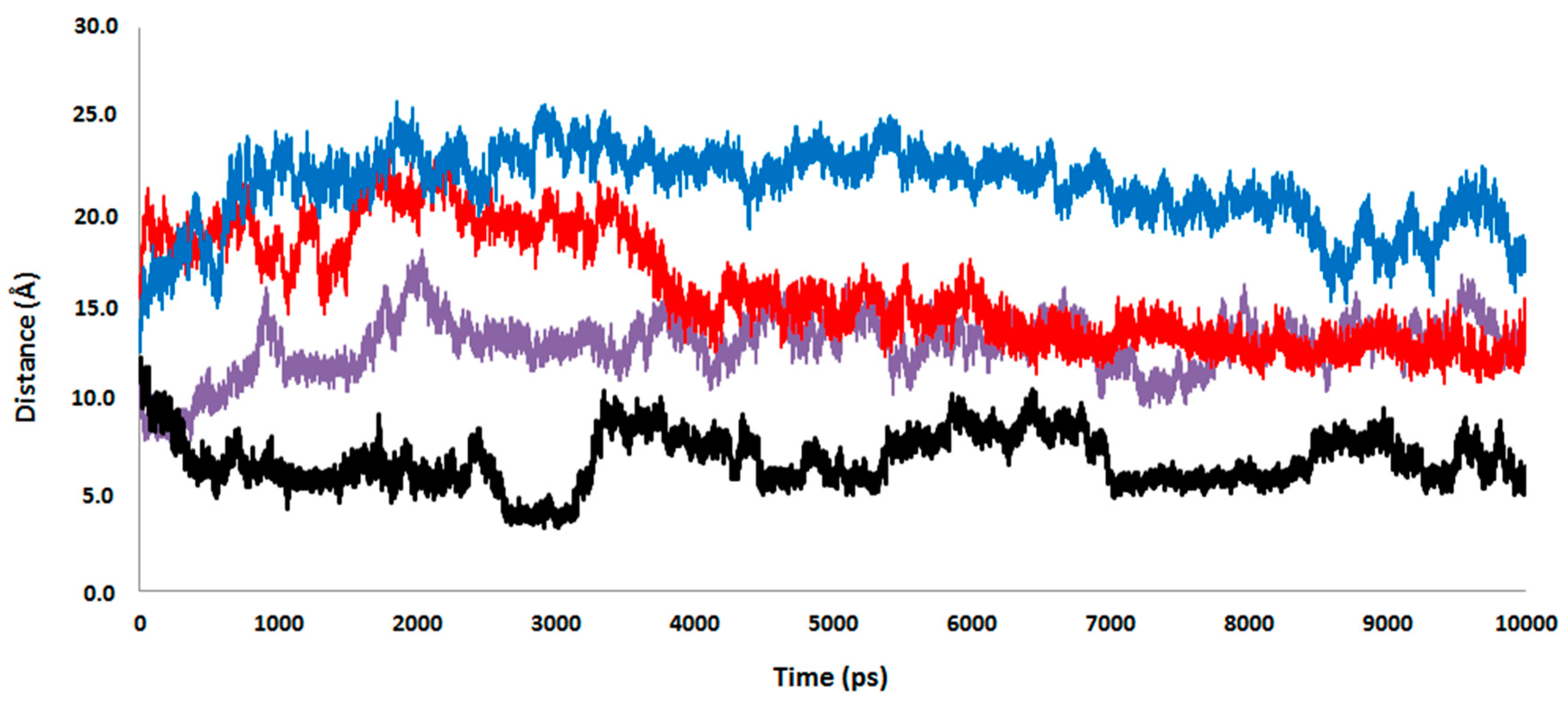 Time evolution of the distances between the closest atom of poly-P and the magnesium atoms in the wild-type (purple line), the magnesium atoms in the 1H2 mutant (black line), the residue 526 in the wild-type (red line), and the residue 526 in the 1H2 mutant (blue line). Results obtained from the 10 ns MD simulation.