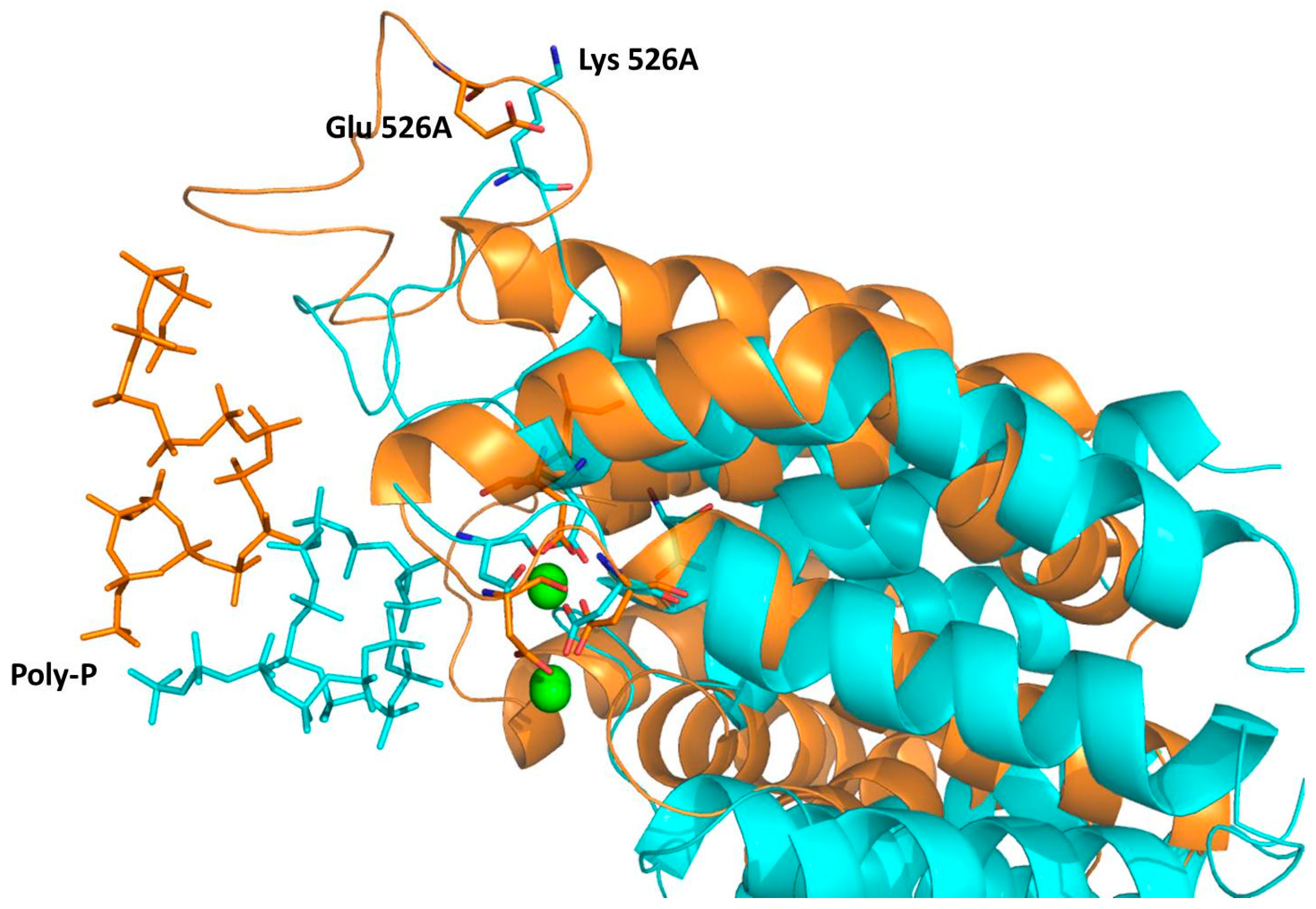 As observed in Figure 6, this distance is even shorter in the wild type than in the 1H2 (see red and blue lines, respectively). Interestingly, replacing the Glu residue on position 526 with a Lys provokes, instead, a significant approximation of the poly-P to the active site of the protein. Thus, despite both wild-type and 1H2 MD simulations starting from the same geometry, a significantly shorter distance between the closest phosphate group of poly-P and any of the Mg cations is reached after 500 ps in the 1H2 than in the wild-type. Thus, it seems that poly-P is better accommodated into the 1H2 mutant active site than in the wild type, in agreement with an experimentally observed higher catalytic activity. This effect can be shown on Figure 7, where an overlapping of both systems after the MD simulations, centered in the Mg cations, is presented. Apparently an indirect effect is produced under mutation of the protein since, despite a movement of the loop containing residue 526, no approximation is observed between the negatively charged poly-P and the new positively charged Lys 526. In fact, poly-P appears to be closer to the residue 526 in the wild-type than in the mutant, as indicated in Figure 6. This is probably due to a bending of the poly-P that favors the approximation to the active site while the new cation preferentially interacts with the solvent.