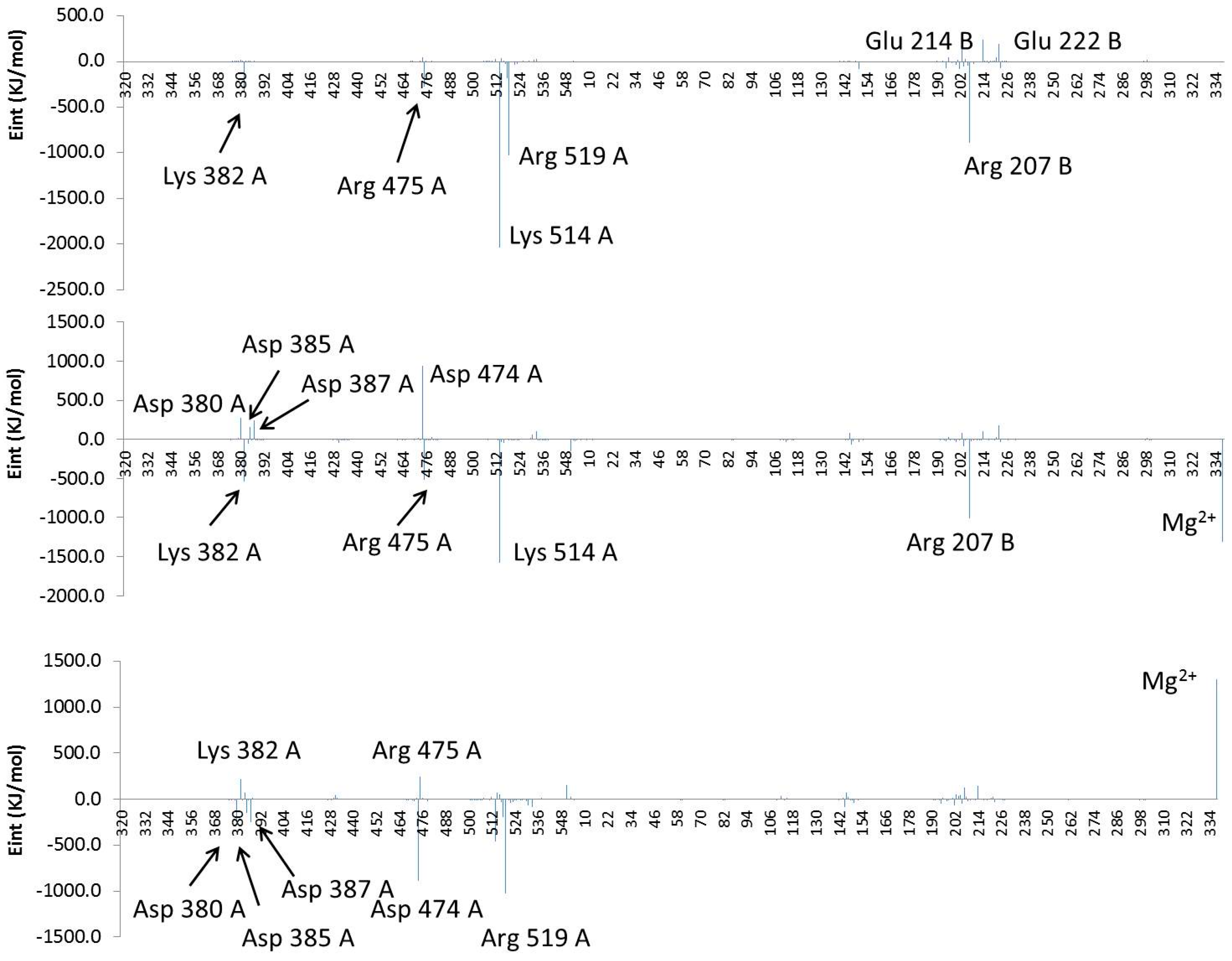 Contribution of individual amino acids to (poly-P)-protein interaction energy (Eint, in kJ·mol−1) for the wild type (top panel), 1H2 mutant (middle panel) and differences between both systems (bottom panel). Residues are ordered according to the sequence, and the Mg2+ ions are added at the end. Results derived from the QM–MM interaction term of the QM/MM optimizations.