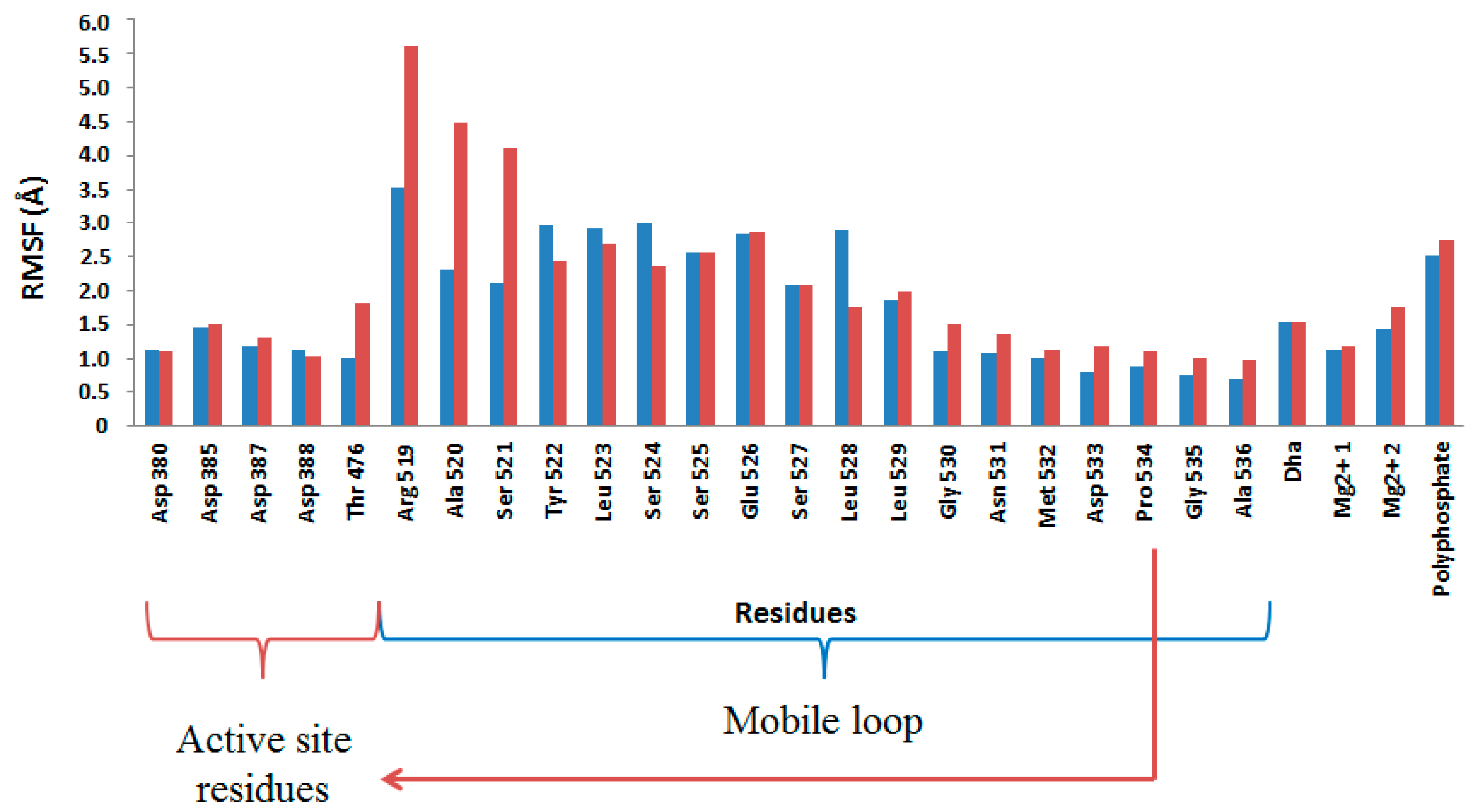 Finally, analysis of the Root Mean Square Fluctuation (RMSF) of the key residues computed from the last 5 ns of the MD simulation on the wild-type and 1H2 mutant show that the later present a greater mobility, especially on the flexible loop, what could be related with the better accommodation of the poly-P. In particular, Arg519 mobility, together with Ala520 and Ser521, significantly increases after mutation of residue 526 (Figure 9). Therefore, further efforts to improve the phosphoryl donor specificity of DHAK from ATP to an inorganic poly-P should be focused in residues around Arg519 in the protein sequence. Finally, it is important to point out that these conclusions derived from the interactions that are important for poly-P fixation should be further tested by studying the next step of the catalytic process; the chemical reaction.