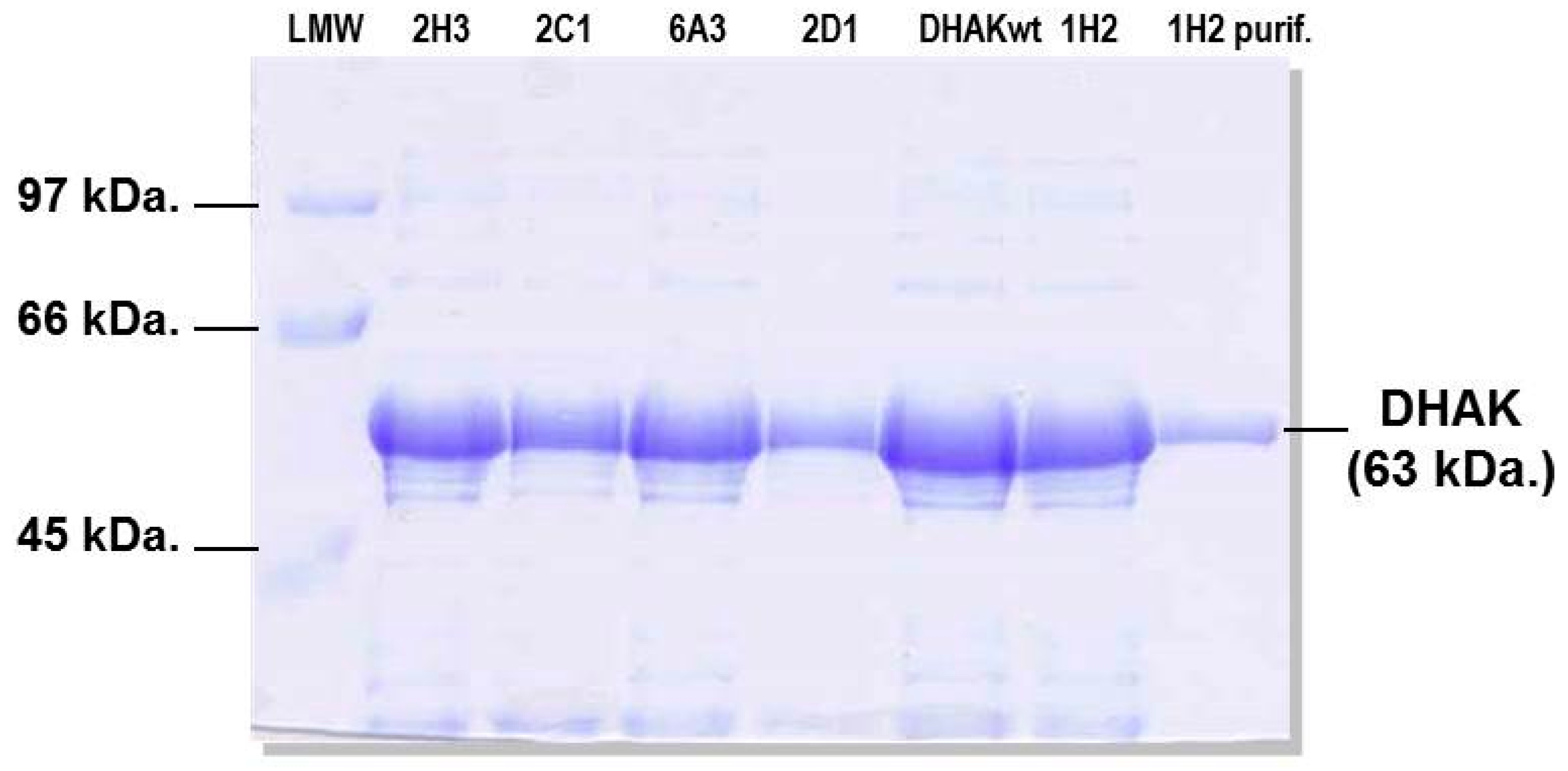 SDS-PAGE analysis of the expression of five mutants and the wild-type DHAK (DHAKwt). Left lane shows mutant 1H2 after purification.