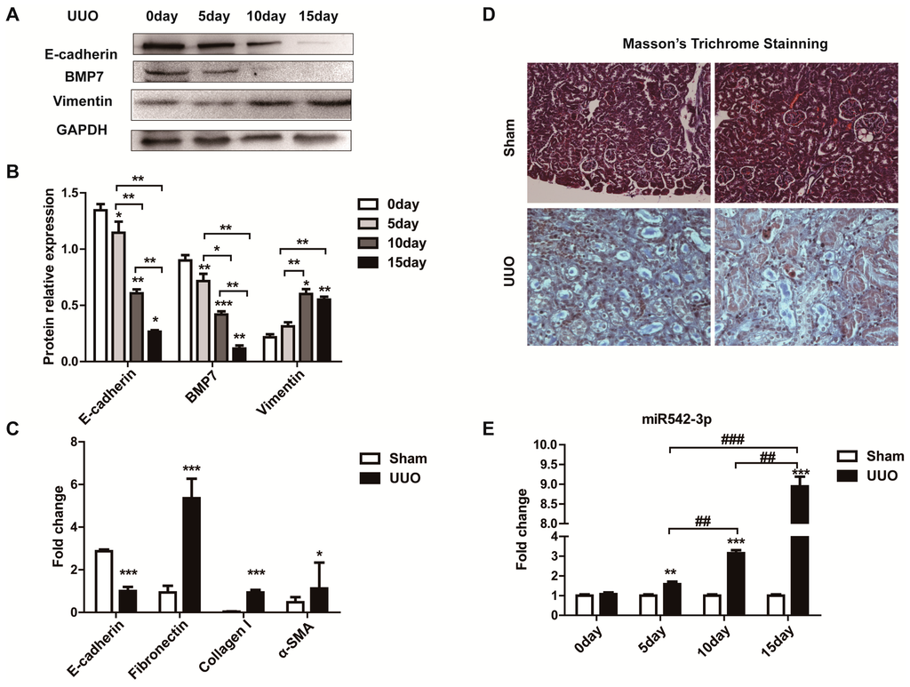 MiR542-3p up-regulation in the unilateral ureteral obstruction (UUO) mice model. (A) Compared with control groups, the E-cadherin and BMP7 proteins were reduced in the UUO kidney; (B) Histogram showed the gray scale quantitative analysis for Western blot, * p < 0.05, ** p < 0.01, *** p < 0.001; (C) The change of expression levels of Epithelial-Eesenchymal Transition (EMT) and fibrotic marker’s mRNA levels, * p < 0.05, *** p < 0.001, mRNAs expression were normalized to 18sRNA; (D) Masson’s Trichrome staining; (E) The miR542-3p expression levels was elevated in kidney of UUO mice model, ** p < 0.01, *** p < 0.001, ## p < 0.01, ### p < 0.001 the miR542-3p expression was normalized to U6. All data are presented as means ± SD from three independent experiments.