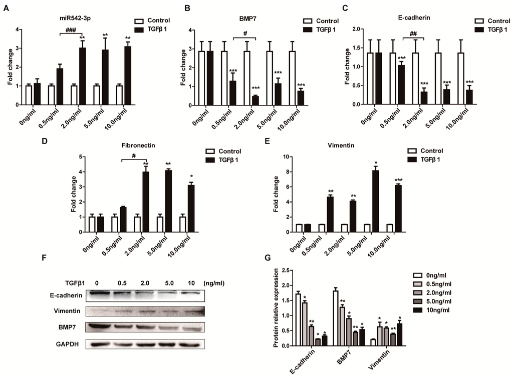 MiR542-3p expression regulated by TGFβ1. (A) miR542-3p expression elevated in the NRK52e cell line induced by different TGFβ1 concentration, the peaking concentration is 2 ng/mL; (B–E) The BMP7 and E-cadherin expressions were opposite to the expression of miR542-3p in the NRK52e cell line induced by different TGFβ1 concentrations. However the expression tendency of Fibronectin and Vimentin are just like that of miR542-3p in the NRK52e cell line induced by different TGFβ1 concentrations; (F) The expression level of BMP7, the epithelial marker, and the mesenchymal marker in NRK52e cells treated with different TGFβ1 concentrations; (G) Histogram shows the gray scale quantitative analysis for Western blot. All data are displayed as means ± SD from three independent experiments, * p < 0.05, ** p < 0.01, *** p < 0.001 versus NRK52e cells without being pre-treated by TGFβ1; # p < 0.05, ## p < 0.01, ### p < 0.001 versus NRK52e cells pre-treated by 0.5 ng/mL TGFβ1, and miR542-3p and mRNAs were normalized to U6 and 18sRNA respectively.