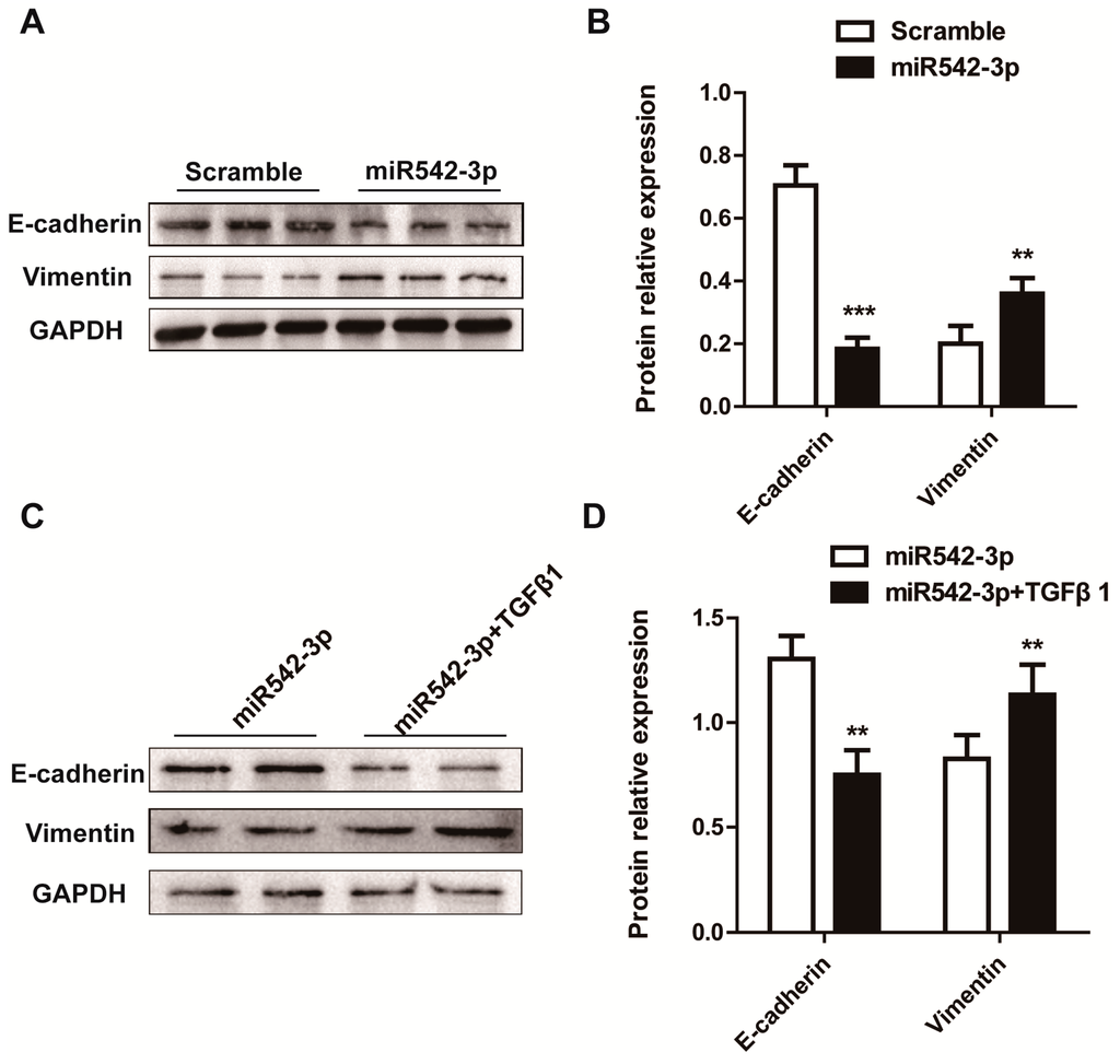 MiR542-3p promotes Epithelial-Mesenchymal Transition (EMT) (A) Western blot results showed the expression levels of E-cadherin and Vimentin in NRK52e cells induced by 50 nM control mimics or miR542-3p; (B) Histogram showed the gray scale quantitative analysis for Western blot results; (C) Western blot results showed the expression levels of E-cadherin and Vimentin in NRK52e cells induced by 50 nM miR542-3p with or without 2.0 ng/mL TGFβ1; (D) Histogram showed the gray scale quantitative analysis for Western blot results. All data are displayed as means ± SD from three independent experiments, ** p < 0.01, *** p < 0.001.