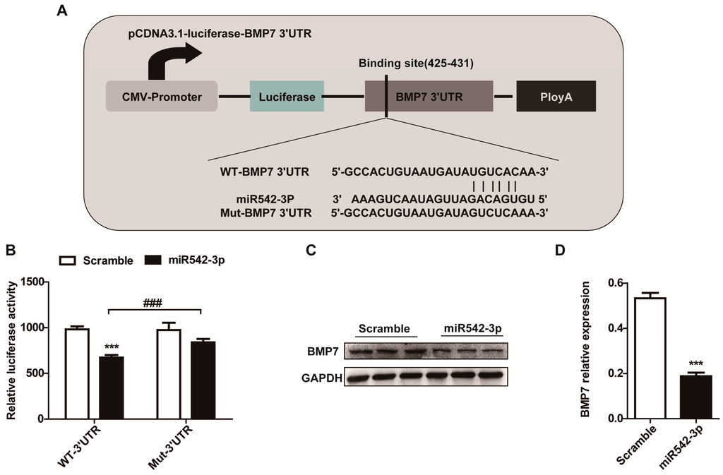 MiR542-3p targets BMP7 3′UTR and suppresses the expression of the BMP7 protein. (A) Schematic presentation of the miR542-3p binding site in the BMP7 3′UTR and wild type or mutant BMP7 3′UTR luciferase reporter vector structures; (B) Dual-luciferase reporter assays indicated that the luciferase activity was suppressed in 293T cells transiently transfected with miR542-3p and wild type BMP7 3′UTR reporter vector. However, the suppression of luciferase activity was eliminated when the binding site of miR542-3p was mutated in BMP7 3′UTR; (C) Western blot analysis of BMP7 expression levels in NRK52e cell transfected with control mimic or miR542-3p; (D) Histogram showed the gray scale quantitative analysis for Western blot results. All data are displayed as means ± SD from three independent experiments, ### p < 0.001, *** p < 0.001.