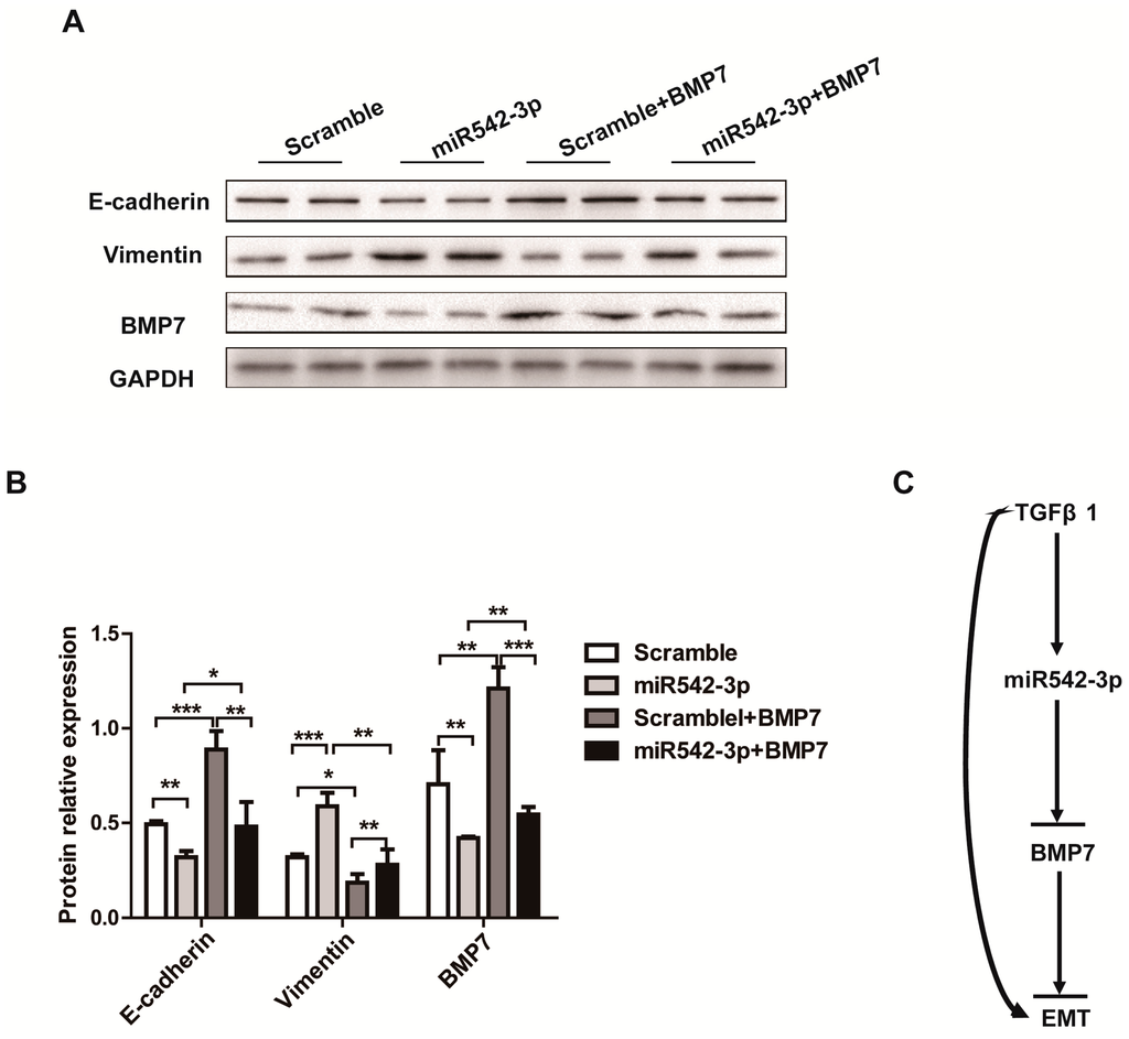 BMP7 attenuates the miR542-3p-induced EMT (A) Western blot results demonstrated that miR542-3p can suppress BMP7 protein expression and promote the Epithelial-Mesenchymal Transition (EMT) in the NRK52e cell line, however, the EMT was suppressed by the transiently transfected BMP7 expression vector (pCDNA3.1-BMP7); (B) Histogram showed the gray scale quantitative analysis for Western blot results. * p < 0.05, ** p < 0.01, *** p < 0.001; (C) The schematic diagrams of miR542-3p promoted Epithelial-Mesenchymal Transition (EMT).