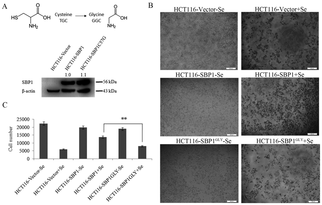 SBP1GLY was impaired in its ability to protect HCT116 cells from selenite-induced toxicity. (A) Codon 57 of SBP1 was changed from a cysteine to a glycine and expression constructs representing the native and mutated SBP1 were introduced into HCT116 cells that do not produce detectable levels of SBP1. SBP1 signals were quantified and normalized to β-actin. Relative intensities were indicated; (B) HCT116 cells transfected with vector, pIRES2-SBP1, or pIRES2-SBP1GLY were treated with 10 µM sodium selenite for 48 h and then photoed under microscope. Scale bar = 200 µm; and (C) cell number was quantified using ImageJSoftware. Results were analyzed with Student’s t-test and shown as mean ± SD. ** p < 0.01.