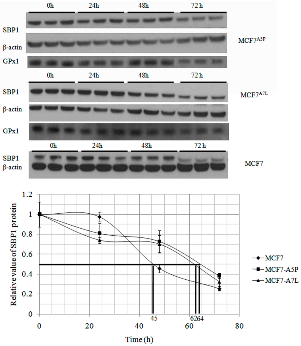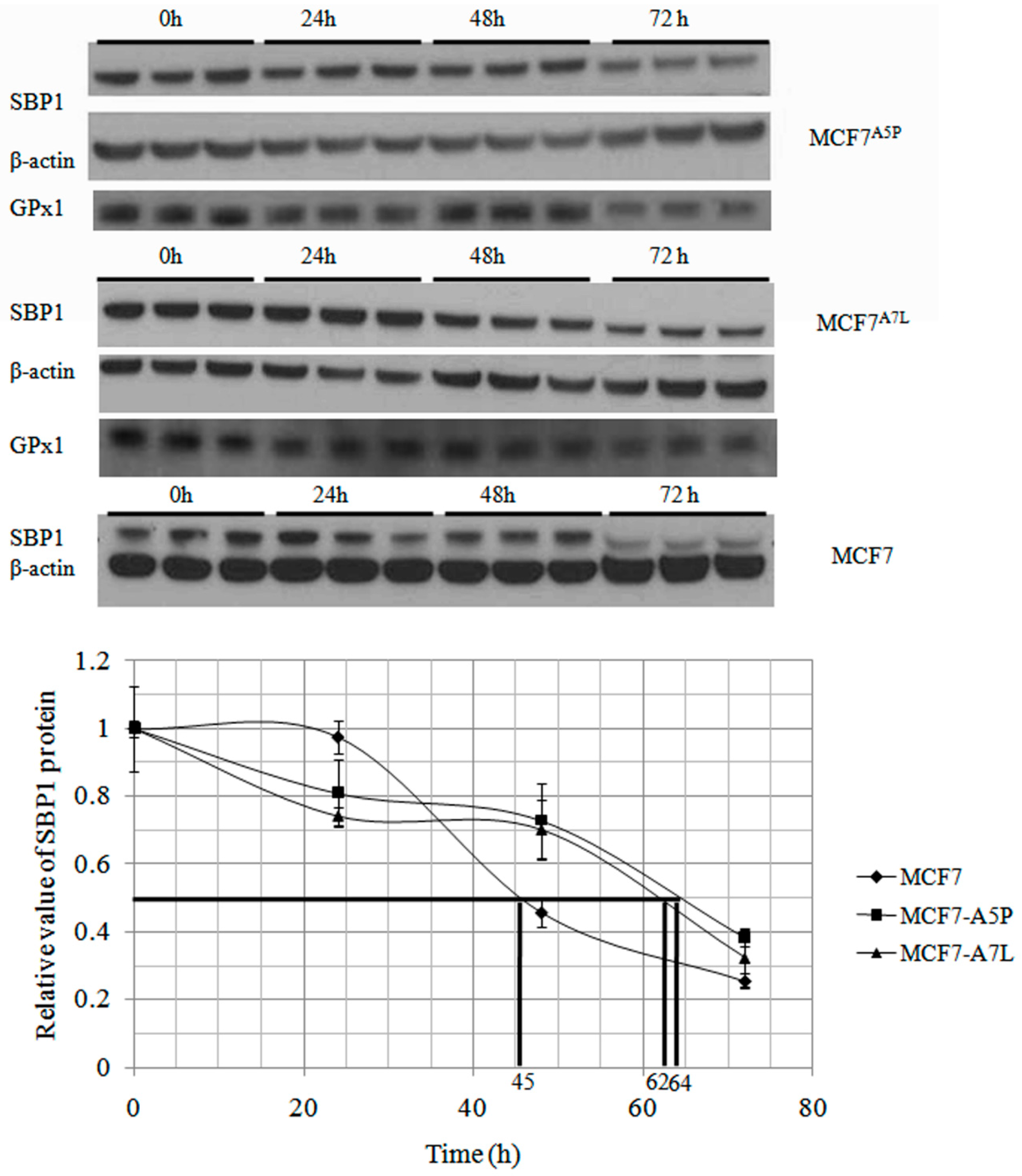 GPx1 extends endogenous SBP1 protein half-life. After treated with 100 µg/mL cycloheximide for 24, 48, and 72 h, different MCF7 derivative cells were harvested and protein levels of SBP1 were determined by immunoblot analysis. The signals were quantified by densitometry using ImageJ Software and normalized to β-actin. The determined half-life of SBP1 was 45, 64, and 62 h in MCF7, MCF7A5P, and MCF7A7L cells, respectively. The differences between MCF7 and MCF7A5P, MCF7A7L cells are statistically significant (p < 0.05).