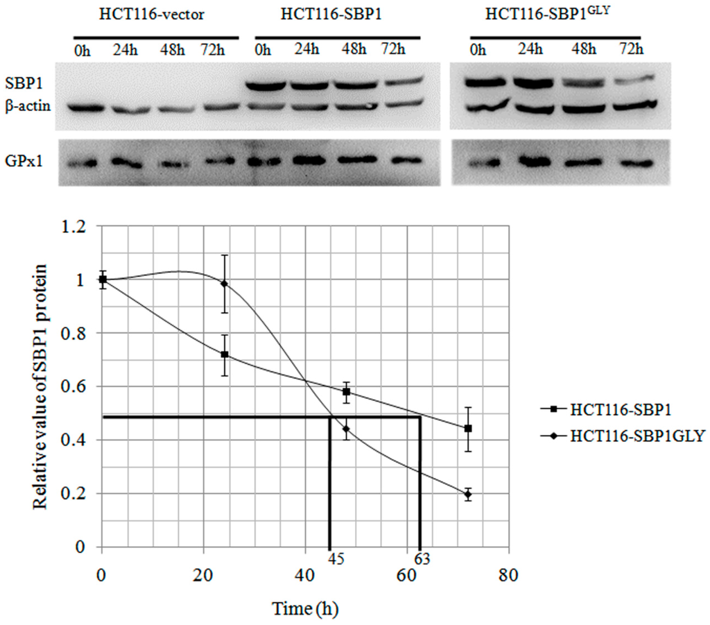 SBP1GLY has a shorter protein half-life than SBP1. HCT116 cells transfected with vector, pIRES2-SBP1, or pIRES2-SBP1GLY were treated with 100 µg/mL cycloheximide for 24, 48 and 72 h and then protein levels of SBP1 were determined by immunoblot analysis. The signals were quantified by densitometry using ImageJ Software and normalized to β-actin. The determined half-life of SBP1 and SBP1GLY were 63 and 45 h in HCT116 cells which has a statistically significant difference (p < 0.05).
