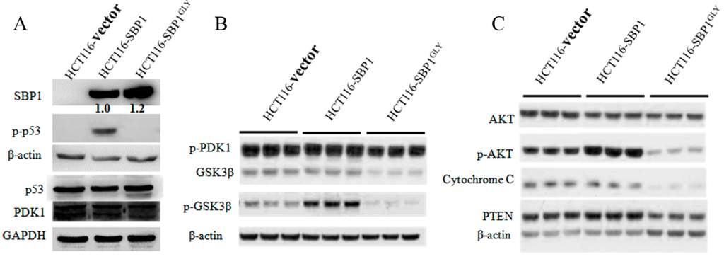 Differential effects of wild-type SBP1 and SBP1GLY on signaling pathways relevant to carcinogenesis. (A–C) After 48 h of transfection of HCT116 cells with vector, pIRES2-SBP1, or pIRES2-SBP1C57G, protein levels including phospho-p53, p53, phospho-PDK1, PDK1, GSK3β, phospho-GSK3β, total AKT, phospho-AKT (serine 473), PTEN, and cytochrome C were examined by immunoblot analysis. SBP1 signals were quantified and normalized to β-actin. Relative intensities were indicated.
