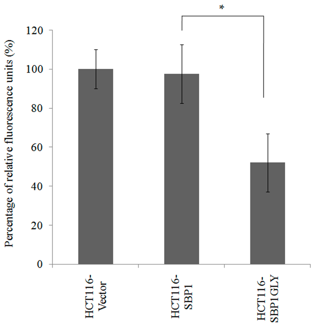SBP1GLY induced mitochondrial damage in HCT116 cells. Mitochondrial damage in HCT116 cells expressing either SBP1 and SBP1GLY, or the empty vector, were examined by using nonyl-acradine orange which assesses mitochondrial damage by staining cardiolipinin the inner mitochondrial membrane. Relative fluorescence units quantified using excitation and emission filters at 580 nm and 630 nm were reverse-related with cell mitochondrial damage. Results were analyzed with Student’s t-test and shown as mean ± SD. * p < 0.05.