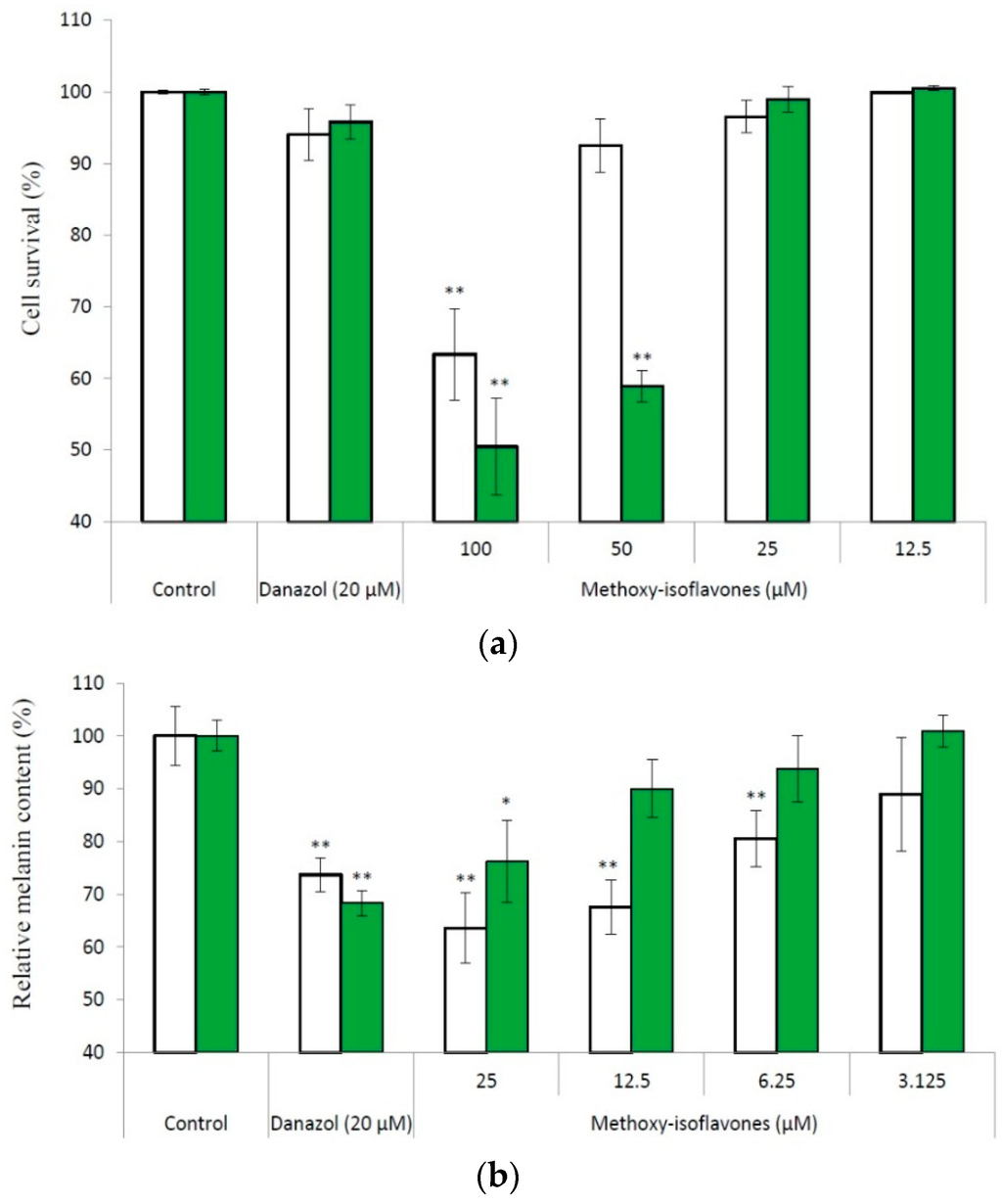 - Goh, M.J.; Park, J.S.; Bae, J.H.; Kim, D.H.; Kim, H.K.; Na, Y.J. Effects of ortho-dihydroxyisoflavone derivatives from Korean fermented soybean paste on melanogenesis in B16 melanoma cells and human skin equivalents. Phytother. Res. 2012, 26, 1107–1112. [Google Scholar] [CrossRef] [PubMed]