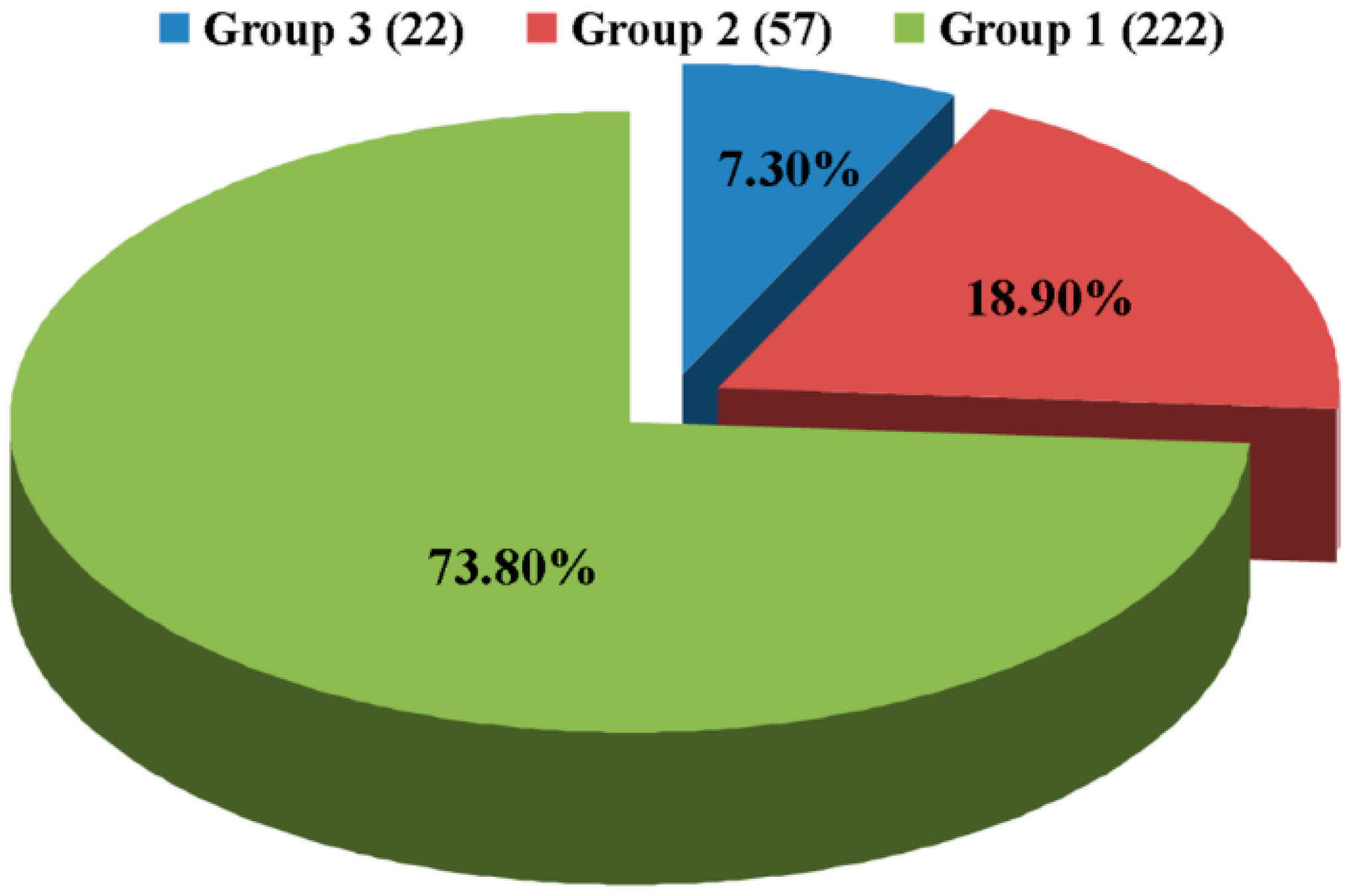 Classification of the Tn5 random insertion mutants based on their virulence to watermelon. Group 1 contains 222 mutants with three, four, and five scales of disease severity; Group 2 contains 57 mutants with two scales of disease severity; Group 3 contains 22 mutants with 0 and 1 scale of disease severity. Disease severity index (5, 4, 3, 2, 1 and 0): lesion area was equal to >90%, 73%–90%, 55%–72%, 37%–54%, 19%–36%, and 0%–18% of the wild type, respectively.