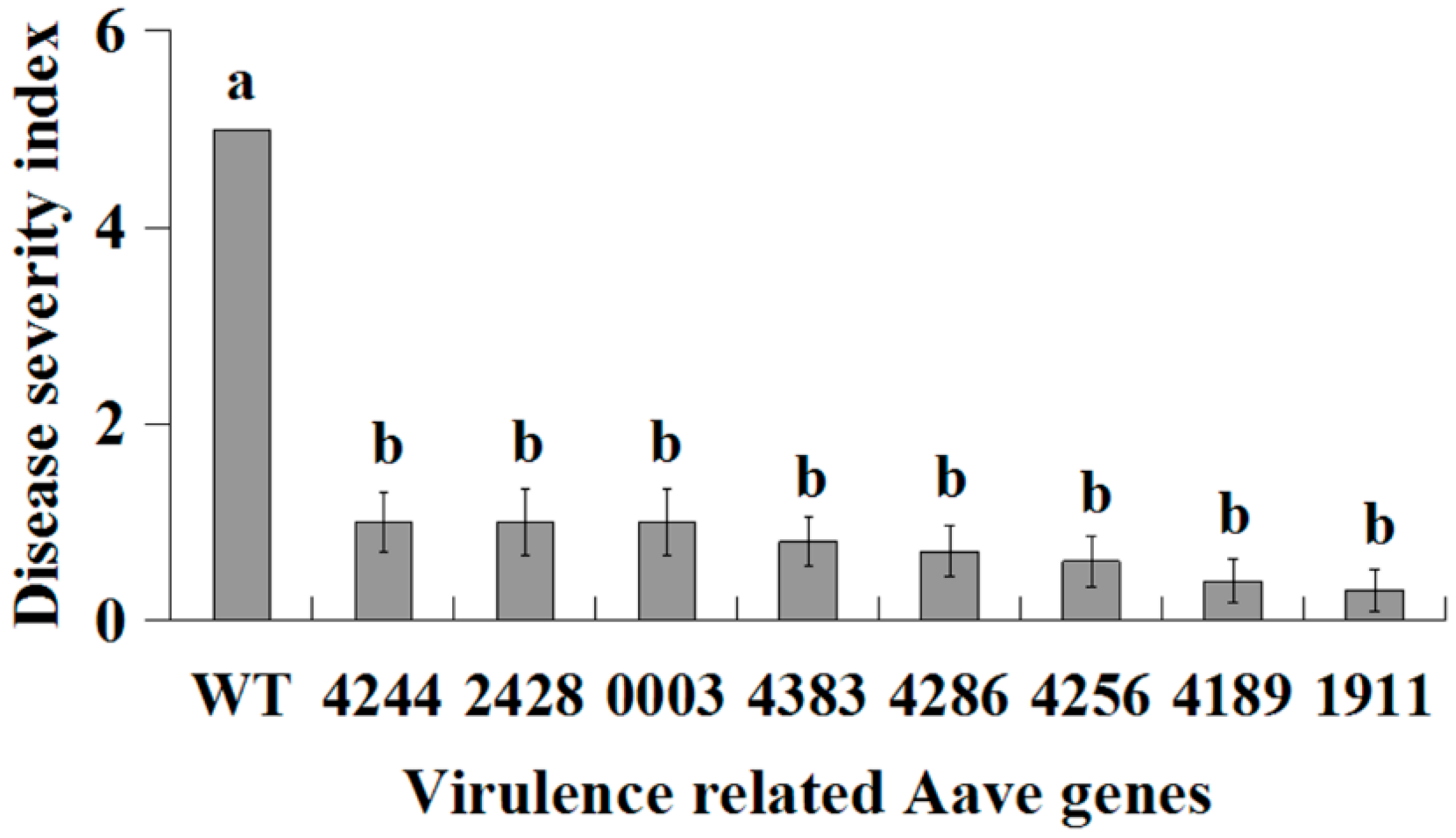 The virulence to watermelon was evaluated based on the needle puncturing method [41], which was carried out by inoculating the leaves of watermelon seedling with the wild-type and the mutants. The mutants were grown on LB medium containing 50 μg/mL kanamycin and then grown at 30 °C with shaking at 200 rpm for 16 h. Pins impregnated with inoculum were used to stab watermelon leaves, while the wild type of strain A1 and LB medium were used as a positive and negative control, respectively. Watermelon seedlings were kept in an incubator for five days in a day/night temperature of 30/25 °C, then the diseased incidence in leaves were calculated. Disease severity index was determined as described by Jiang et al. [42] with minor modification based on shoot-area of inoculated leaves relative to the pathogen control: five means lesion area >90% of the pathogen control, while four to zero means that lesion area was within 73%–90%, 55%–72%, 37%–54%, 19%–36%, and 0–18% of the pathogen control, respectively. The experiment was repeated three times, while each treatment consists of six replicates.