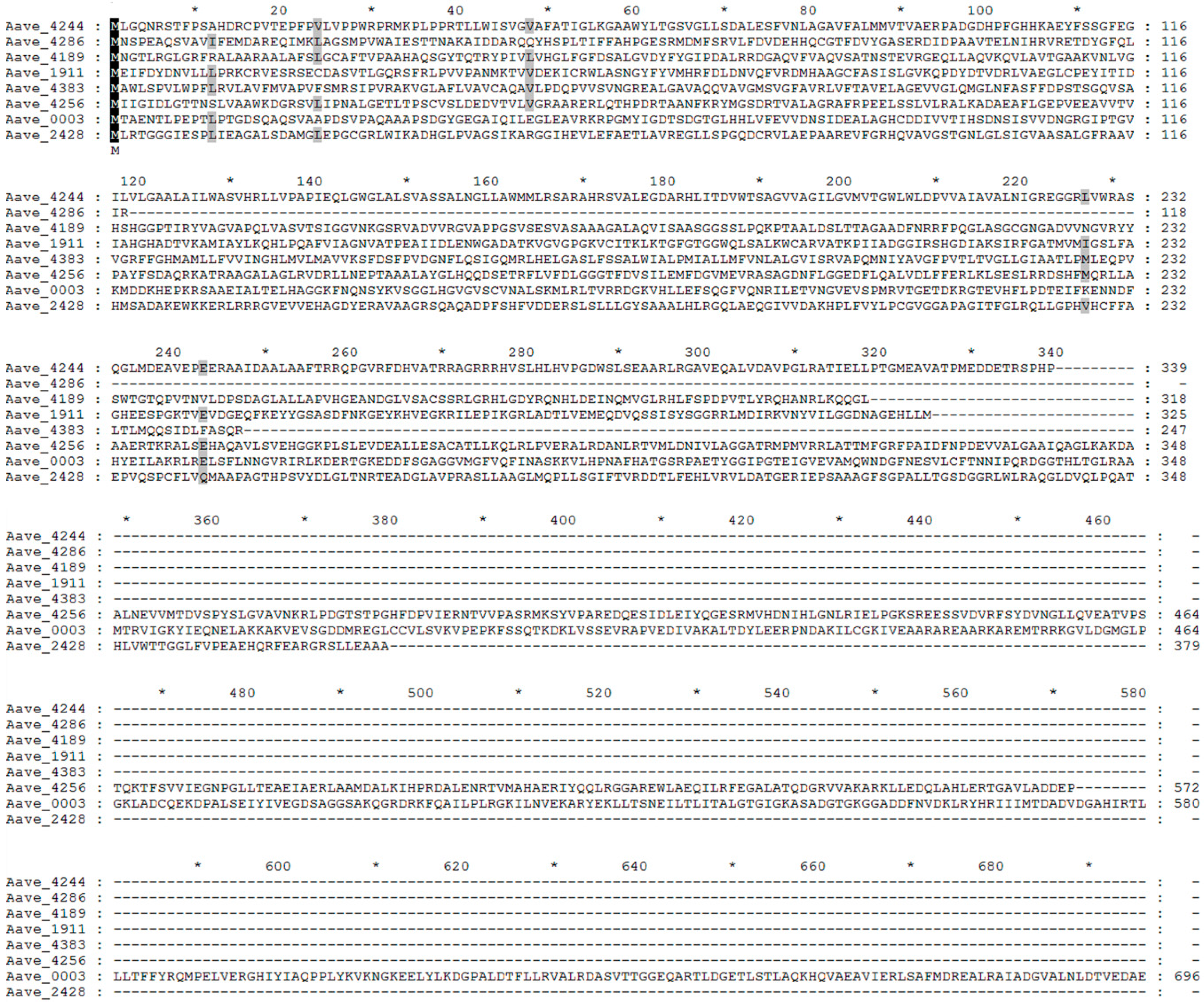 Traditional exploratory visual analysis of multiple sequence alignment. A depiction of the multiple sequence alignment of the predicted proteins of the eight virulence-related genes. *, addition of position by 10 amino acids; black background, the sequences were identical; gray background, the sequences were similar.