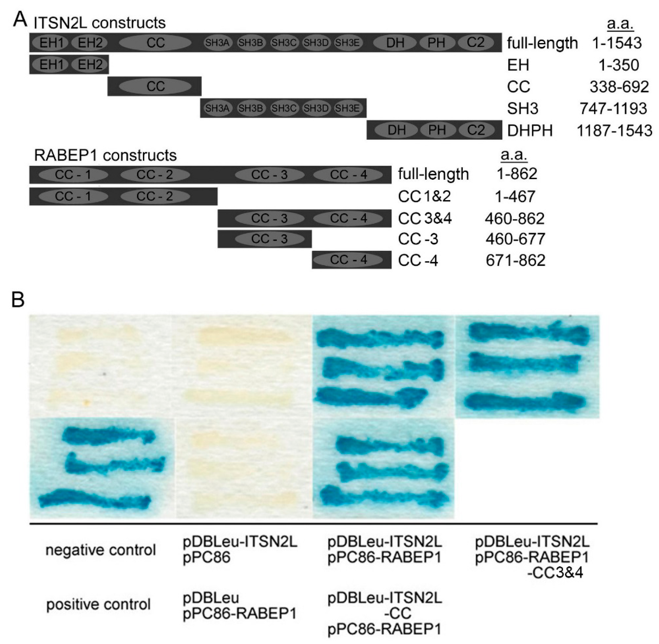 To confirm the interaction between ITSN2L and RABEP1, MaV203 yeast strain was transfected with combinations of pDBLeu-ITSN2L along with pPC86-RABEP1, pDBLeu-ITSN2L-CC with pPC86-RABEP1, and pDBLeu-ITSN2L with pPC86-RABEP1-CC3&4. The Beta-Gal assay shown in Figure 1B, blue colonies were observed only in cells containing pDBLeu-ITSN2L and pPC86-RABEP1, or pDBLeu-ITSN2L-CC and pPC86-RABEP1, or pDBLeu-ITSN2L and pPC86-RABEP1-CC3&4, or in positive control containing pPC97-CYH2s and pPC86-dE2F (Figure 1B).