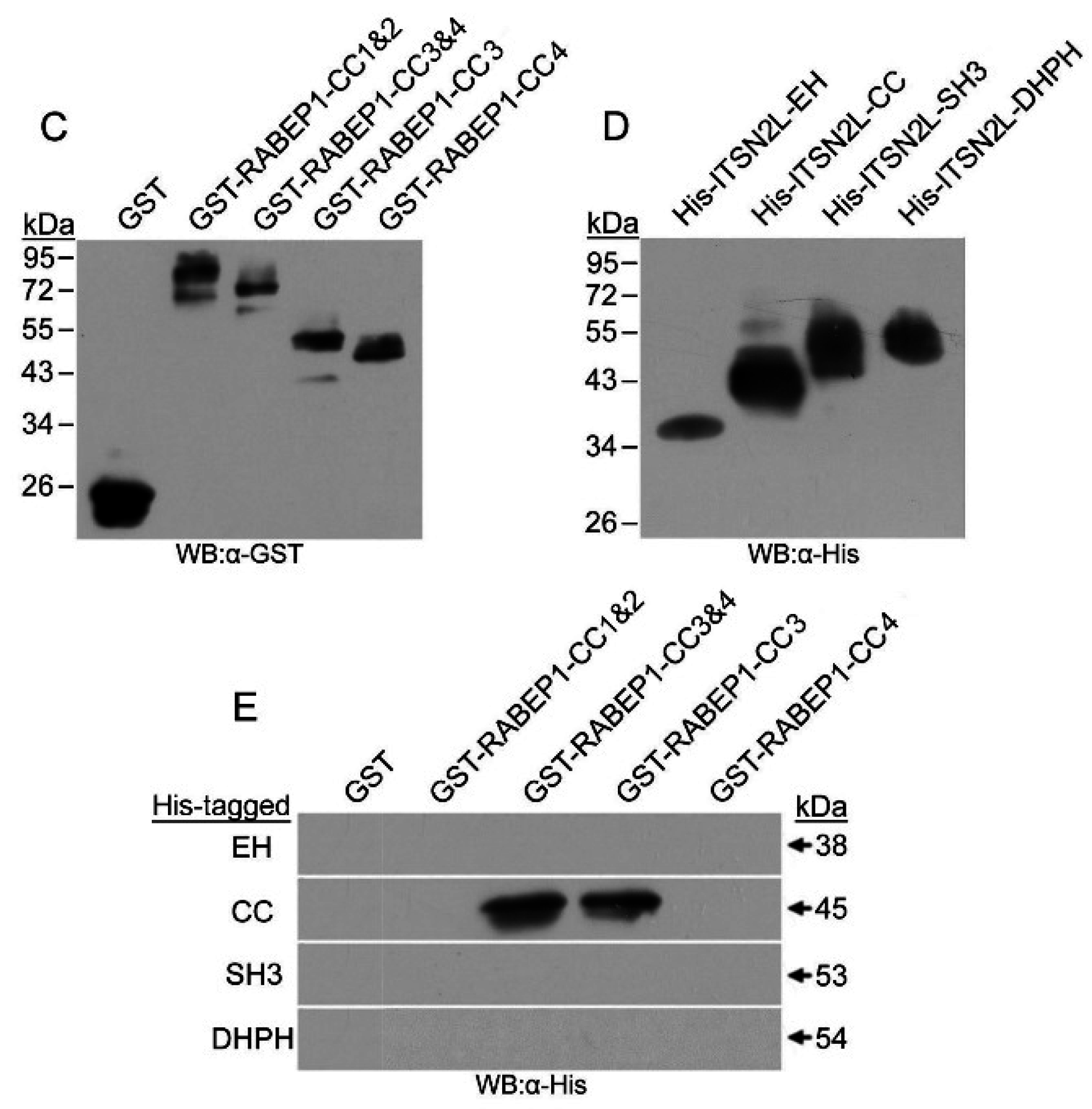 Physical interactions between ITSN2L and RABEP1 subdomains were then examined in vitro by GST pull-down assays. Truncated RABEP1 GST fusion and ITSN2L His fusion proteins (Figure 1A) were purified (Figure 1C). As shown in Figure 1D, the His-ITSN2L-CC fusion protein bound to the GST-RABEP1-CC3&4 and GST-RABEP1-CC3 fusion protein. In contrast, His-ITSN2L-EH/SH3/DHPH fusions did not show binding to GST-RABEP1-CC1&2 fusions. These results indicated that the interaction between these two proteins is introduced by the ITSN2L CC domain and RABEP1 CC3.