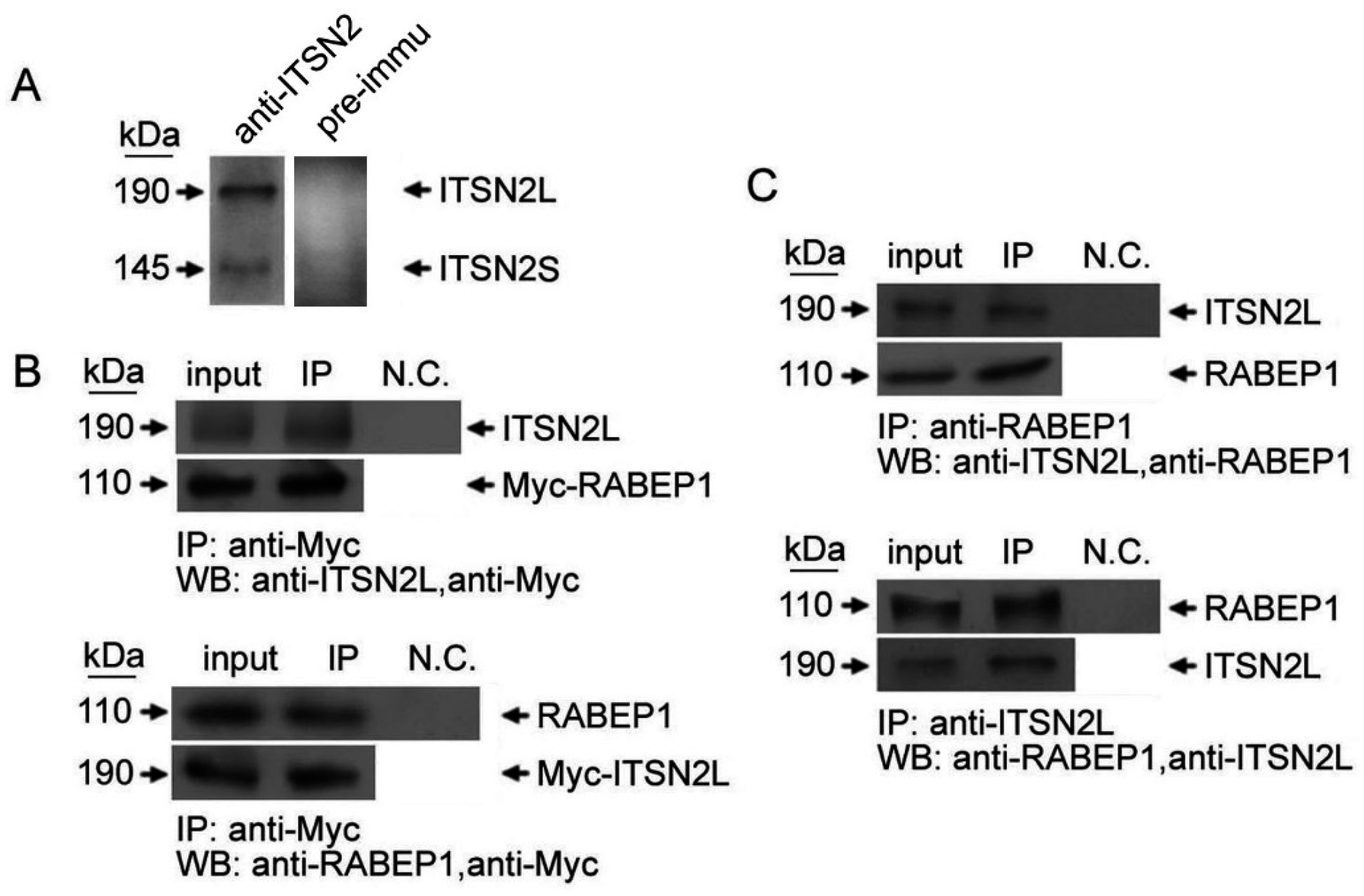Co-immunoprecipitation of ITSN2L and RABEP1. (A) Rabbit ITSN2L recognize both human ITSN2 long and short isoforms; (B) HeLa cells were transfected with Myc-RABEP1 or Myc-ITSN2L, respectively, and cell lysates were subjected to immunoprecipitation using rabbit polyclonal anti-Myc or rabbit preimmune IgG. The IP materials were analyzed with anti-ITSN2L (upper panel) or anti-RABEP1 (lower panel), respectively; (C) Lysates from HeLa cells were subjected to IP using mouse monoclonal anti-RABEP1 or rabbit pre-immune IgG and immunoblotted with rabbit polyclonal anti-ITSN2L (upper panel), or IP using rabbit polyclonal anti-ITSN2L or rabbit preimmune IgG and immunoblotted with mouse monoclonal anti-RABEP1 (lower panel).