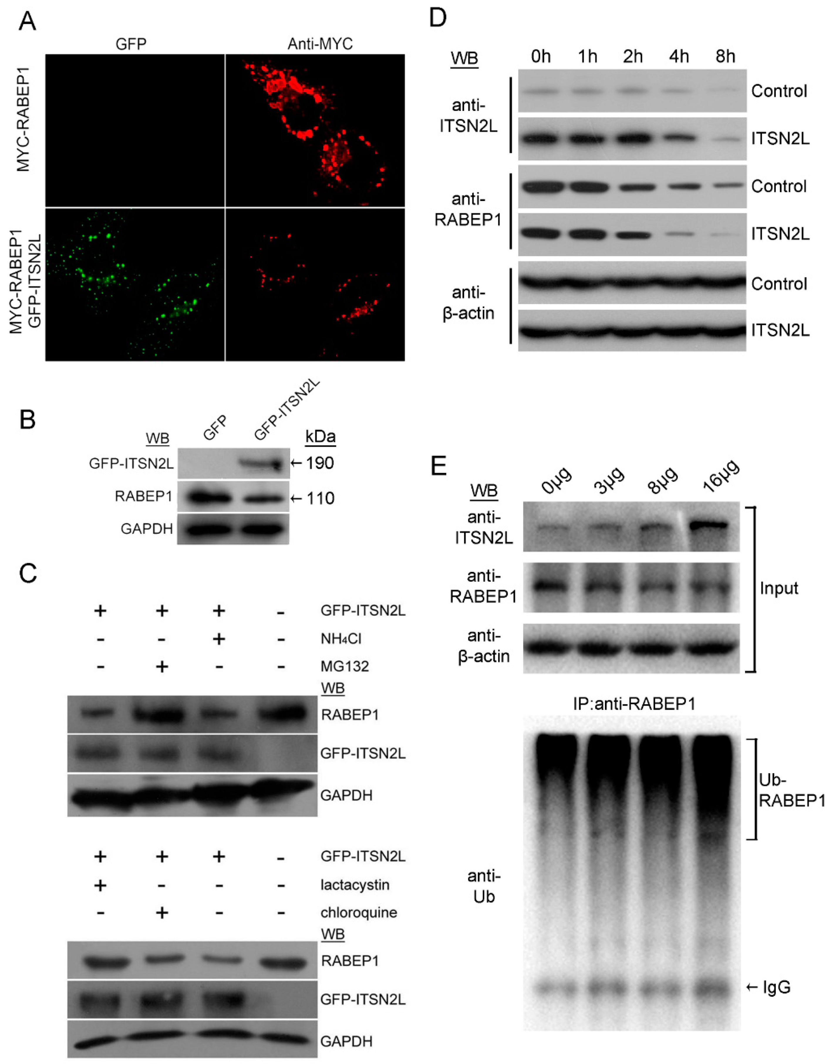 Previous studies have demonstrated that ITSN could function as scaffold for E3 ubiquitin ligase [6]. However, it is not clear which pathway was involved in the reduction of RABEP1 induced by ITSN2L. To investigate this, GFP-ITSN2L overexpressing cells were pre-treated with lysosome inhibitor NH4Cl, chloroquine or proteasome inhibitor MG132, lactacystin to examine the inhibition effects on RABEP1. These inhibition assays revealed that suppression of RABEP1 by ITSN2L could be reversed by proteasome inhibitor MG132 and lactacystin, but not lysosome inhibitor NH4Cl and chloroquine (Figure 4C). Meanwhile, the protein half-life of RABEP1 under GFP-ITSN2L overexpressing was measured. GFP or GFP-ITSN2L transfected HeLa cells were treated with 100 μg/mL of cycloheximide 24 h post transfection for 1, 2, 4, or 8 h. Harvested samples were detected by ITSN2L and RABEP1 antibodies. Data showed RABEP1 degradation was significantly accelerated (Figure 4D). Furthermore, the ubiquitination status was also tested. HeLa cells in 10 cm dishes were transfected with GFP or 3, 8, 16 μg of GFP-ITSN2L plus 3 µg of Myc-Ub plasmid. Control GFP vector was used as compensation for each group (up to 19 µg total per transfection). 20 μM of MG123 were added 48 h post transfection for 5 h. Immunoprecipitations of RABEP1 were then performed by using equal amount of protein extracted from each sample. Precipitates were then detected by anti Ub and RABEP1 antibodies (Figure 4E).The result indicated an increase of RABEP1 ubiquitination after ITSN2L overexpressing in a dose-dependent manner. In summary, our data demonstrated that ITSN2L promote RABEP1 ubiquitination and degradation through proteasome pathway.