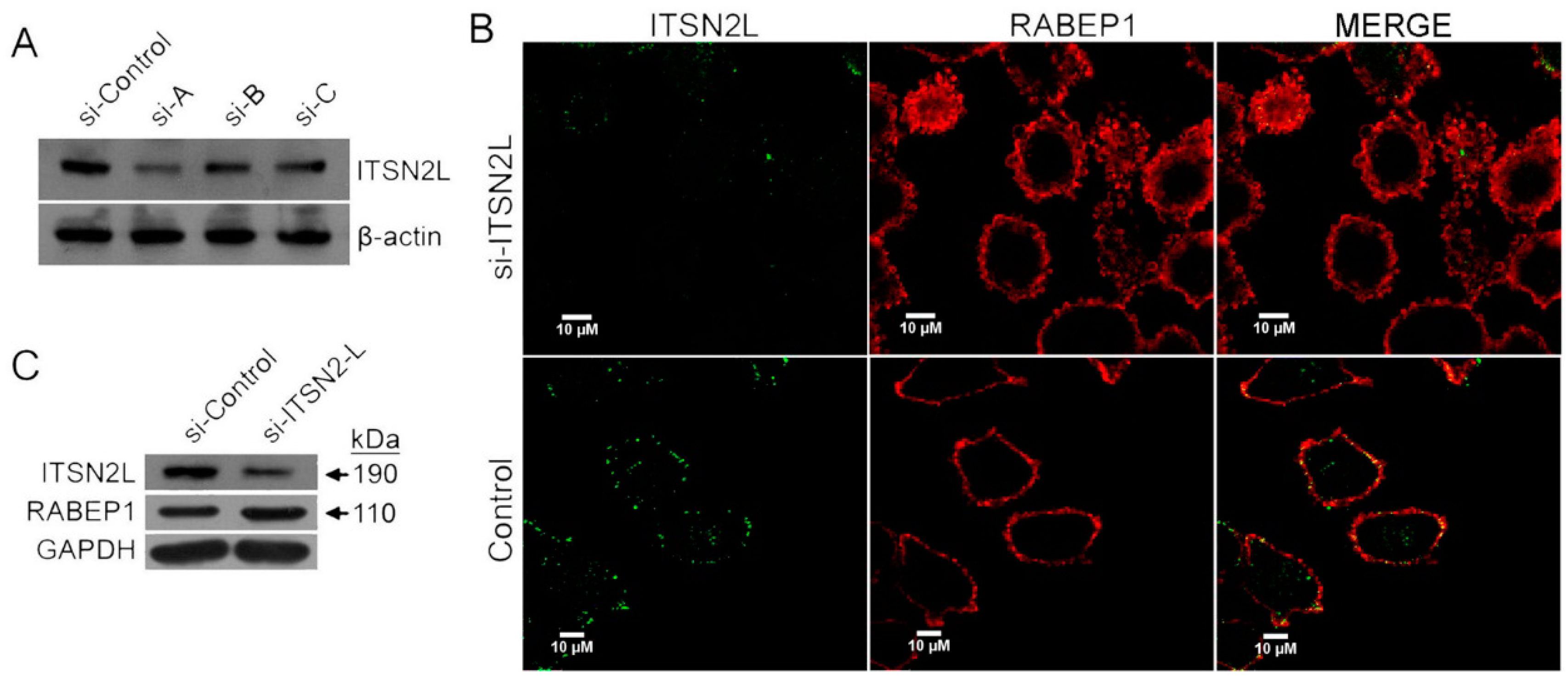 ITSN2L knockdown induce up-regulation of RABEP1. (A) HeLa cells transfected with siRNA-A, B, C and control respectively. Cell lysates were detected by western blotting with anti-ITSN2L and anti-β-actin antibody; (B) HeLa cells transfected with siRNA-A and control, subsequently stained with anti-ITSN2L and anti-RABEP1 antibody. Photos of si-RNA and control samples were taken under the same conditions of exposure; (C) HeLa cells transfected with siRNA-A and control. Cell lysates were detected by anti-ITSN2L, anti-RABEP1 and anti-GAPDH antibodies.