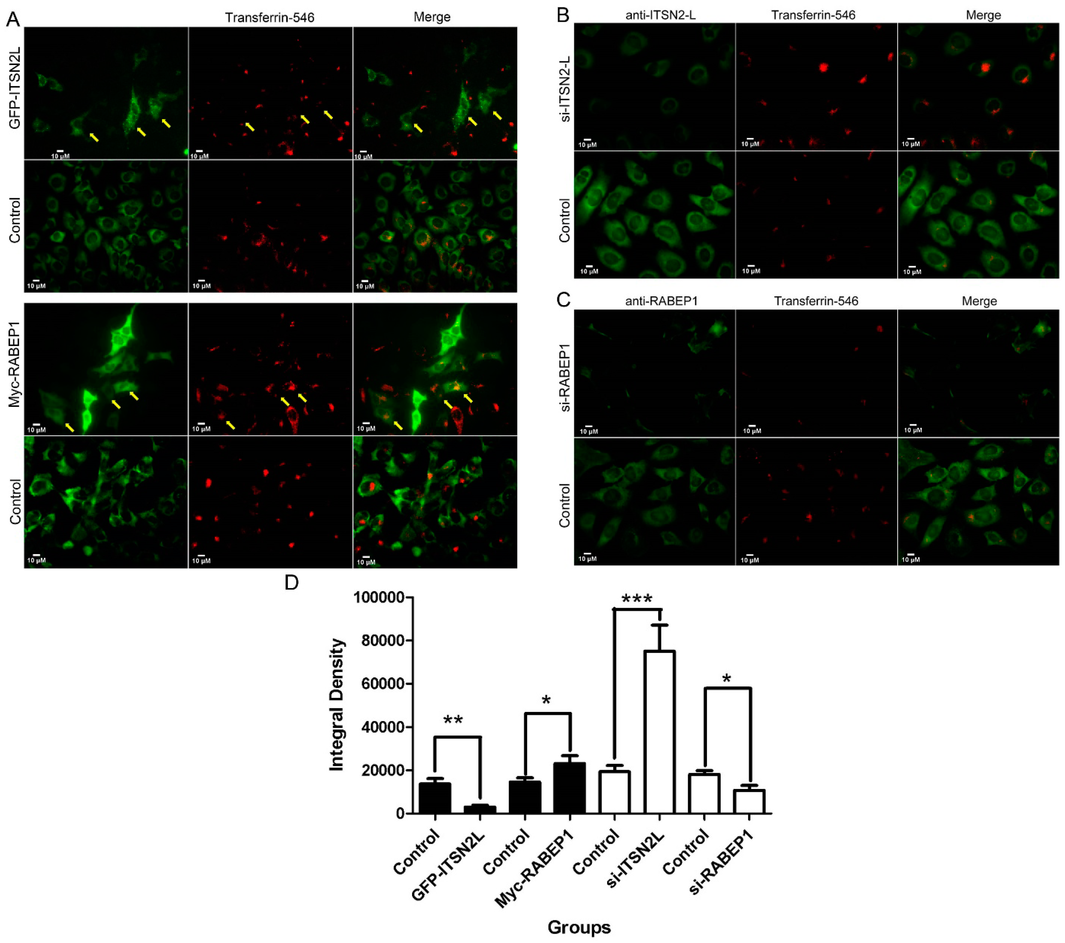 ITSN2L and RABEP1 play opposite roles in Transferrin uptake. (A) HeLa cells were transfected with GFP-ITSN2L or Myc-RABEP1. Overexpression of GFP-ITSN2L inhibited Tf uptake, while Myc-RABEP1 enhanced Tf uptake. Representative cells were marked by yellow arrows; (B) Knock down ITSN2L using si-RNA enhances the uptake of Tf; (C) Reduced RABEP1 expression caused a strong inhibition of Tf internalization. Pictures of si-RNA and control were acquired under the same exposure conditions; (D) Tf uptake signals of each group were measured with integral densities of red channel by imageJ and statistical analysis were carried out by t-test (*** p < 0.001, ** p < 0.01, * p < 0.05).