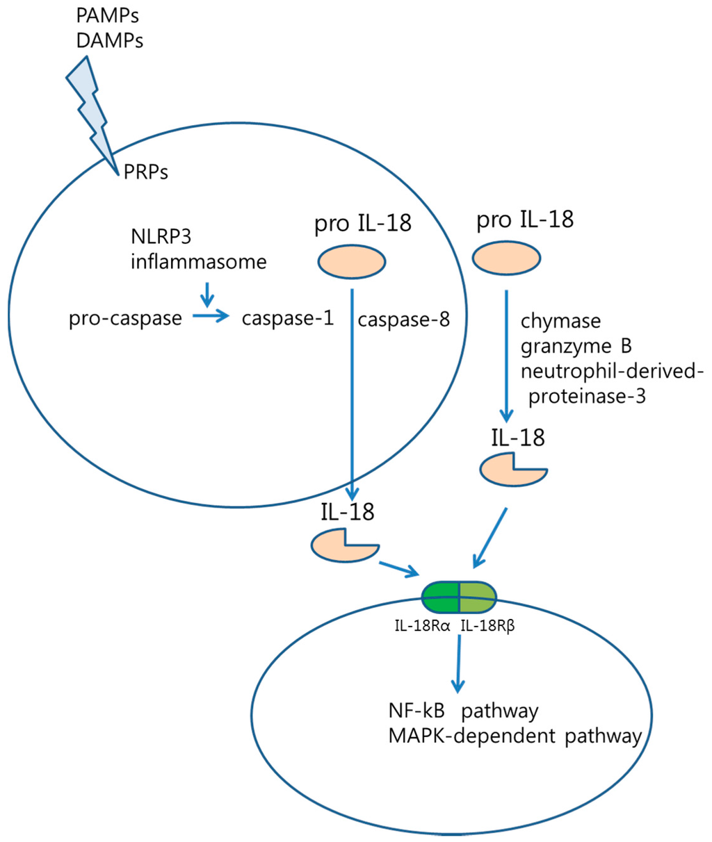 Interleukin (IL)-18 processing stimuli including pathogen-associated molecular patterns (PAMPs) and damage-associated molecular patterns (DAMPs) is detected by pattern-recognition receptors (PRPs), and induce the oligomerization of the nucleotide-binding domain and leucine-rich repeat pyrin domain containing protein-3 (NLRP3) inflammasome. IL-18 is processed and activated by chymase, granzyme B, neutrophil-derived proteinase-3, as well as intracellular caspase-1. In addition, a heterodimer IL-18R is linked with NF-κB pathway. (