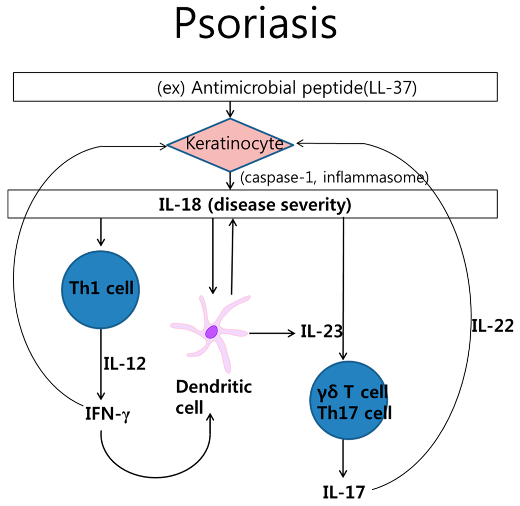 Interleukin (IL)-18 in the pathogenesis of psoriasis. The complex interplay of cytokines and cells is involved pathologic process in psoriasis. Keratinocyte stimulated by cathelicidin LL-37 produces IL-18. IL-18 activated Th1 cell, which produces interferon-γ (IFN-γ). IL-18 also stimulates Th17cell or γδ T cell, which secrete IL-17. In addition, dendritic cell produces IL-18 as well as IL-23.
