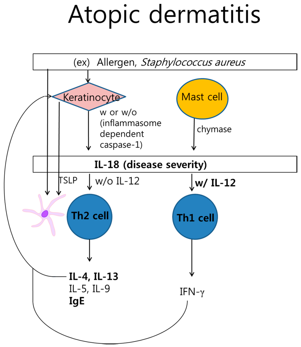 Exposure to allergens such as house dust mites and to lesional infections induces the expression of IL-18. IL-18 contributes to the development of Staphylococcus aureus-associated AD in humans as well as in mice [50,51]. In NC/Nga atopic dermatitis mouse model, IL-18 and mast cell had been shown to be important inflammation induced by Staphylococcus aureus [51]. Previous studies reported a significant increase of IL-18 by staphylococcal enterotoxin A (SEA) in vitro and in vivo [52,53]. Monocyte-derived dendritic cells induced by Malassezia furfur in peripheral blood stimulate the production of IL-18 in addition to that of TNF-α and IL-1β [54]. Additionally, Zedan et al. [55], reported that AD severity (SCORAD score) correlates with the serum IL-18 concentration. Furthermore, chronic stress suppresses the HPA axis and aggravates Th2 immune responses with the lack of immunosuppressive effects in allergic diseases [56]. CRH acts as an anti-inflammatory factor as well as a pro-inflammatory factor, dependent on environmental conditions. Lee et al. [57], demonstrated that CRH decreases IL-18 expression in dendritic cells, which express CRH-receptors (CRH-R) in patients with AD. Here, stress may modulate immune responses by influencing the expression of IL-18 in AD. Furthermore, a recent genetic study revealed that single-nucleotide polymorphisms in IL-18, such as IL-18 gene—607C/A (rs1946518) or—137G/C (rs187238), may have a protective effect on AD [58]. Finally, serum IL-18 with crossregulation may be associated with the development and/or manifestations of AD.