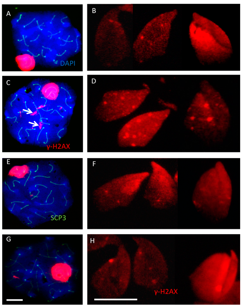 - Chicheportiche, A.; Bernardino-Sgherri, J.; de Massy, B.; Dutrillaux, B. Characterization of Spo11-dependent and independent phospho-H2AX foci during meiotic prophase I in the male mouse. J. Cell Sci. 2007, 120, 1733–1742. [Google Scholar] [CrossRef] [PubMed][Green Version]