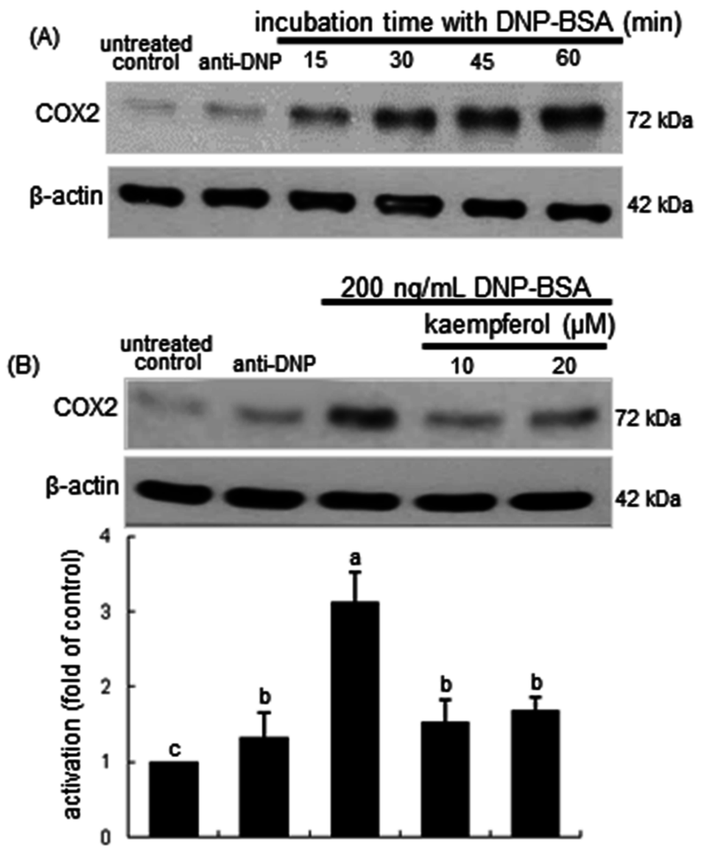 Temporal response of cyclooxygenase 2 (COX2) induction (A) and inhibitory effect of kaempferol on COX2 induction (B) in sensitized RBL-2H3 cells. Rat basophilic leukemia RBL-2H3 cells were sensitized by the addition of 0.5 μg/mL anti-2,4-dinitrophenol (anti-DNP) and stimulated for 5–60 min with 200 ng/mL DNP-bovine serum albumin (BSA) in the absence and presence of 10–20 μM kaempferol. Equal amounts of cell lysate proteins were subject to 8% SDS-PAGE and Western blot analysis with a primary antibody against COX2. The blot data (mean ± SEM, n = 3) in the bar graphs represent quantitative results obtained from a densitometer. Values in bar graphs not sharing a common letter refer to significantly different at p < 0.05.