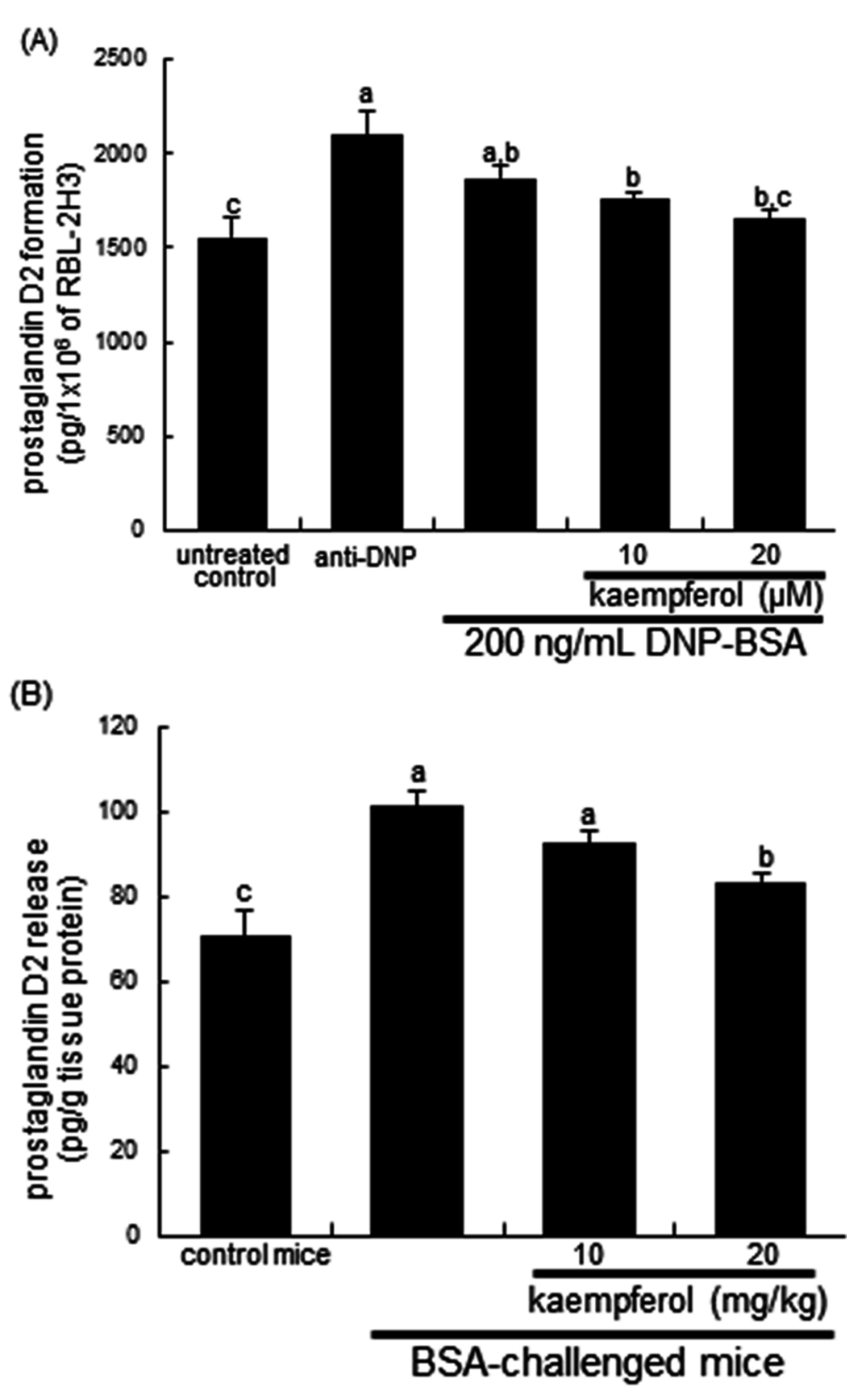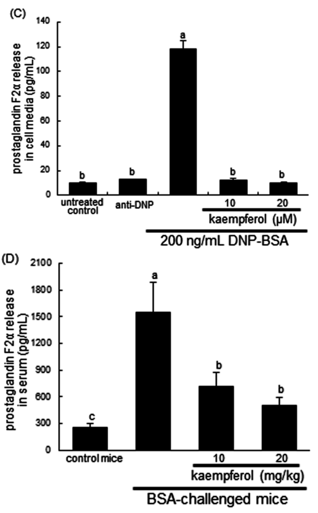 Production of prostaglandin D2 (PGD2) and prostaglandin F2α (PGF2α) in sensitized RBL-2H3 cells (A) and BALB/c mice (B). Rat basophilic leukemia RBL-2H3 cells were sensitized by the addition of 0.5 μg/mL anti-2,4-dinitrophenol (anti-DNP) and stimulated with 200 ng/mL of DNP-bovine serum albumin (BSA) in the absence and presence of 10–20 μM kaempferol. For in vivo experiments, BSA-sensitized mice on days 0 and 14 were challenged with 5% BSA on days 28, 29, and 30. Mast cell formation of PGD2 formation (A); mouse lung tissues level of PGD2 (B); mast cell release of PDF2α (C) and mouse serum level of PGF2α (D) were measured by using ELISA kits. Values in bar graphs not sharing a common letter refer to significantly different at p < 0.05.