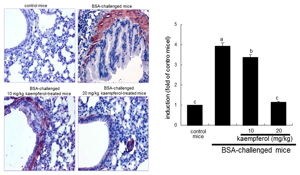 Severe asthma is characterized by airway hypertrophy and hyperplasia of smooth muscle leading to thickening of the airway wall []. This study investigated that kaempferol inhibited airway smooth muscle hypertrophy and hyperplasia. There was dense brown staining in mouse airway walls of BSA-challenged mice observed, evidenced by staining with anti-α-smooth muscle actin (α-SMA) and 3.3′-diaminobenzidine (Figure 5). However, the airway hypertrophy and hyperplasia were retarded by orally administrating ≥10 mg/kg kaempferol to 5% BSA-exposed mice, indicating that kaempferol may alleviate antigen-triggered bronchial thickening and constriction due to smooth muscle contraction (Figure 5).