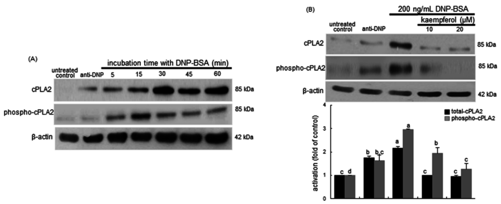 Time course response of activation of cPLA2 (A) and inhibitory effects of kaempferol on cellular level of phospho-cPLA2 (B) in sensitized RBL-2H3 cells. Rat basophilic leukemia RBL-2H3 cells were sensitized by adding 0.5 μg/mL anti-2,4-dinitrophenol (anti-DNP) and stimulated for 5–60 min with 200 ng/mL of DNP-bovine serum albumin (BSA) in the absence and presence of 10–20 μM kaempferol. Equal amounts of cell lysate proteins were subject to 8% SDS-PAGE and Western blot analysis with a primary antibody against total cPLA2 and phospho-cPLA2. β-Actin protein was used as an internal control for cellular total cPLA2 and phospho-cPLA2. The bar graphs (mean ± SEM, n = 3) in the bottom panel represent quantitative results obtained from a densitometer. Values not sharing a common letter refer to significantly different at p < 0.05.