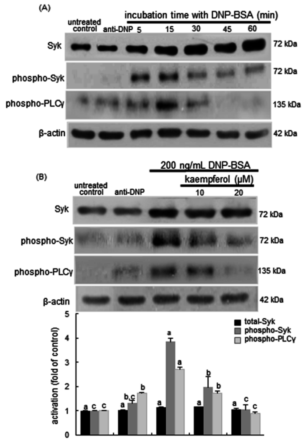 Temporal response of the activation of Syk and phospholipase Cγ (PLCγ) (A) and inhibitory effects of kaempferol on the activation of Syk and PLCγ (B) in RBL-2H3 cells. Rat basophilic leukemia RBL-2H3 cells were sensitized by adding 0.5 μg/mL anti-2,4-dinitrophenol (anti-DNP) and stimulated for 5–60 min with 200 ng/mL of DNP-bovine serum albumin (BSA) in the absence and presence of 10–20 μM kaempferol. Equal amounts of cell lysate proteins were subject to 8% SDS-PAGE and Western blot analysis with a primary antibody against total Syk, phospho-Syk and phospho-PLCγ (three separate experiments). β-Actin protein was used as an internal control for cellular total Syk, phospho-Syk, and phospho-PLCγ. The bar graphs (mean ± SEM) in the bottom panel represent quantitative results obtained from a densitometer. Values not sharing a common letter refer to significantly different at p < 0.05.