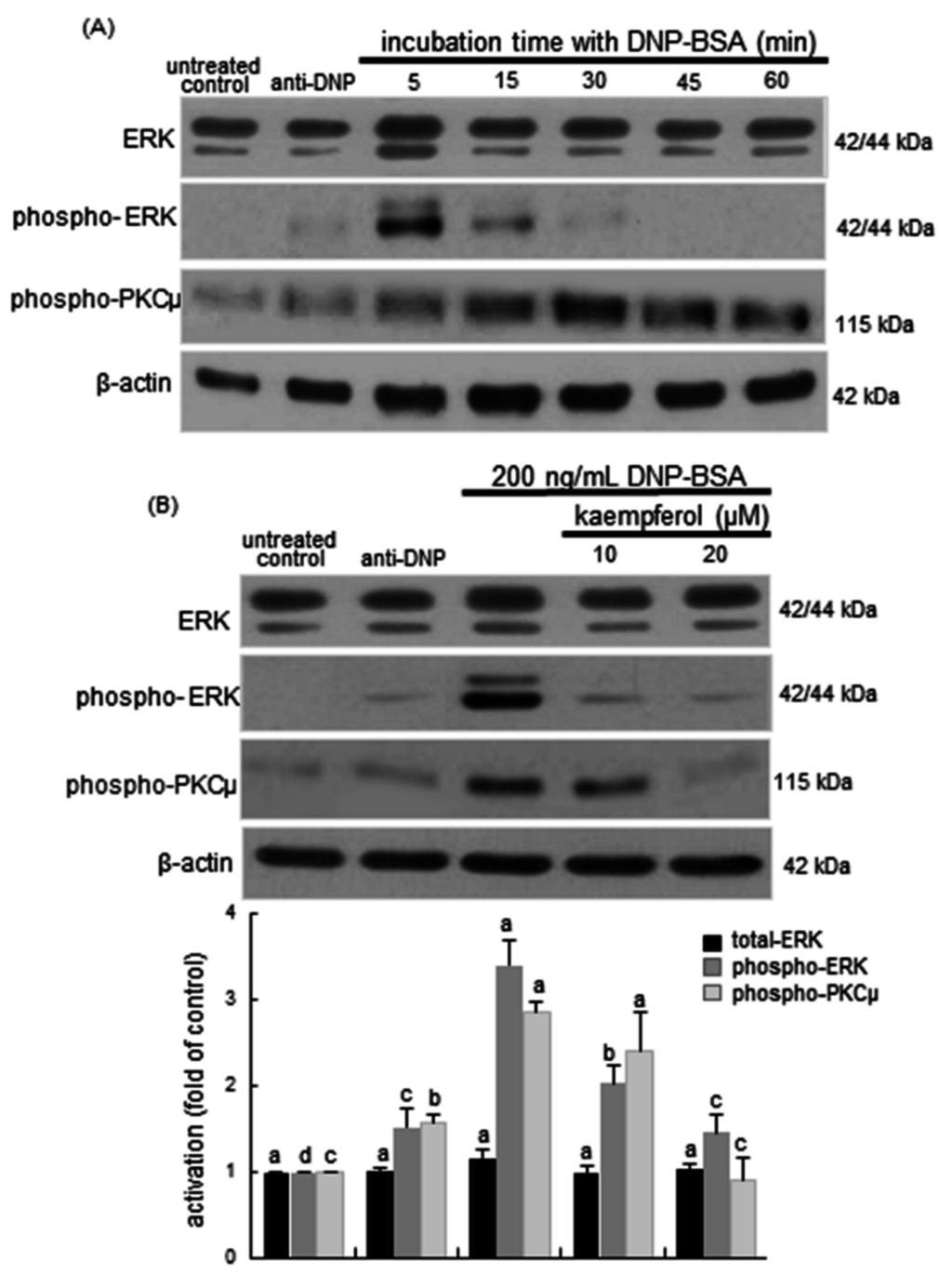 Time course responses of the activation of protein kinase Cμ (PKCμ) and extracellular signal-regulated kinase (ERK) (A); and inhibitory effects of kaempferol on cellular levels of total ERK, phospho-ERK and phospho-PKCμ (B) in sensitized RBL-2H3 cells. Rat basophilic leukemia RBL-2H3 cells were sensitized by addition of 0.5 μg/mL anti-2,4-dinitrophenol (anti-DNP) and stimulated for 5–60 min with 200 ng/mL of DNP-bovine serum albumin (BSA) in the absence and presence of 10–20 μM kaempferol. Equal amounts of cell lysate proteins were subject to 8% SDS-PAGE and Western blot analysis with a primary antibody against total ERK, phospho-ERK, and phospho-PKCμ. β-Actin protein was used as an internal control for total ERK, phospho-ERK, and phospho-PKCμ. The bar graphs (mean ± SEM, n = 3) in the bottom panel represent quantitative results obtained from a densitometer. Values not sharing a common letter refer to significantly different at p < 0.05.