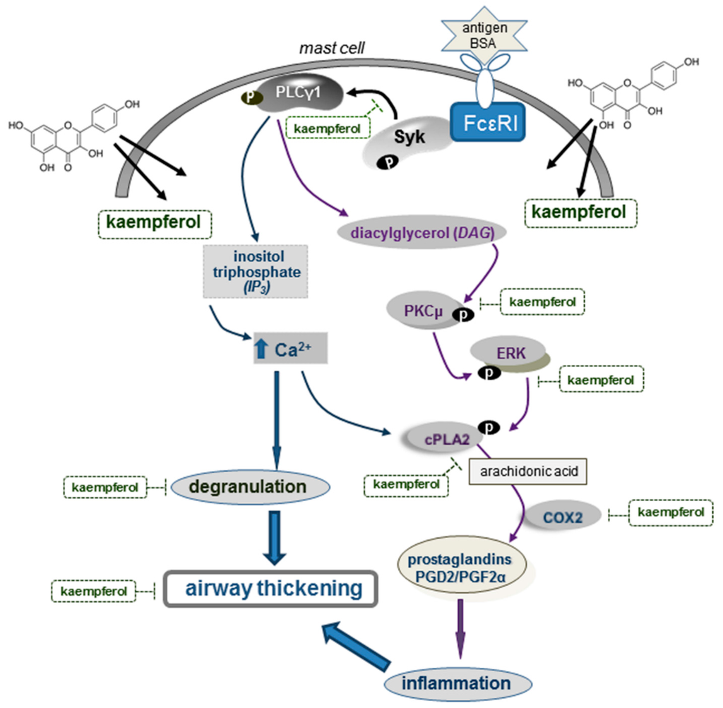 cPLA2 functions as a critical upstream regulator of the eicosanoid production and has been implicated in asthmatic responses to airway resistance []. The remarkable elevation of bronchial and alveolar thickening is observed in cPLA2 knockout mice []. Thus, the blockade of cPLA2 mediation may provide a therapeutic approach to airway and lung injury. One investigation has shown that the cPLA2α inhibition can attenuate PGD2 release and adenosine monophosphate-induced contraction of human bronchi in anti-IgE-stimulated human lung mast cells and late-phase bronchoconstriction in a sheep model of allergic inflammation []. These findings suggest that the inhibition of cPLA2 with kaempferol may represent a new therapeutic option for the treatment of asthma. On the other hand, kaempferol interrupted the activation of the PKCμ, ERK and cPLA2 axis pathway for the COX2 mediation in DNP-BSA-sensitized mast cells. In fact, PKC and ERK induce the phosphorylation of cPLA2 by pro-inflammatory cytokines leading to the modification of airway smooth muscle contraction and remodeling [,]. Accordingly, the inhibition of PKCμ and ERK by dietary kaempferol may block the narrowing and thickening of airways. In addition, this study showed that kaempferol deterred the Syk signaling responsible for PLCγ activation. Similarly, the natural compound homoisoflavanone isolated from Cremastra appendiculata Makino down-regulates the PGD2 production in IgE/antigen-stimulated mast cells through blocking Syk signaling together with the inhibition of cPLA2 []. It has been shown that the Syk inhibition blocks the mast cell degranulation in airways and the early- and late-phase asthmatic responses. Moreover, Syk is a key activator of signaling downstream of multiple surface receptors implicated in asthma, supporting a key role for Syk signaling in mediating allergic airway responses [,] Thus, kaempferol may abrogate COX2-mediated airway thickening by hampering Syk-PLCγ-cPLA2 signaling of antigen-exposed mast cells.