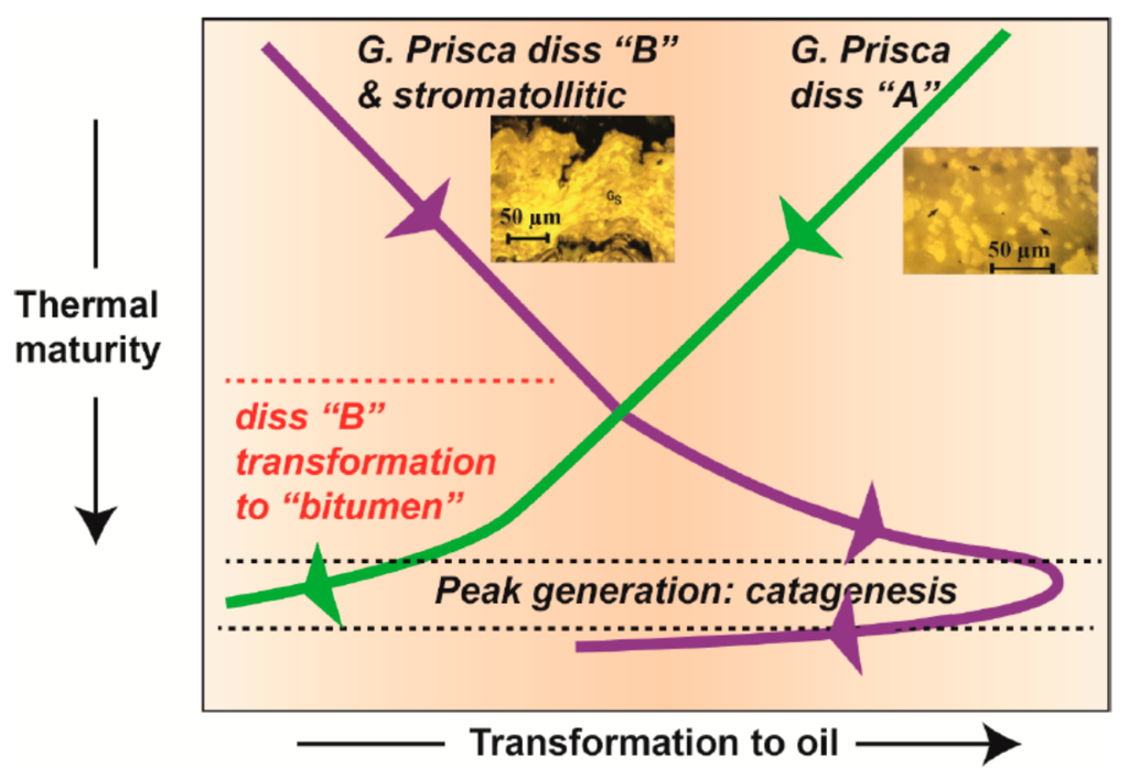 - Stasiuk, L.D.; Kybett, B.D.; Bend, S.L. Reflected light microscopy and micro-FTIR of Upper Ordovician Gloeocapsomorpha prisca alginite in relation to paleoenvironment and petroleum generation, Saskatchewan, Canada. Org. Geochem. 1993, 20, 707–719. [Google Scholar] [CrossRef]