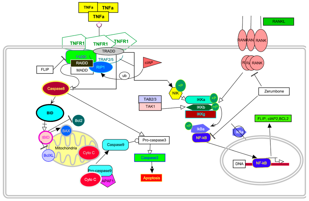 Zerumbone is a sesquiterpene obtained from Zingiber zerumbet Smith. It is known to exhibit anti-cancer activity against several cancers by modulating several proteins to induce apoptosis [10]. Several articles have identified key proteins that can be inhibited by zerumbone for arresting cancer cell growth [11,12,13,14,15,16,17,18,19]. Prasannan et al. [19] reviewed key pathways such as tumor necrosis factor signaling pathway and the phosphinositide-3-kinase/Akt/mTOR pathway modulated by zerumbone. It has shown anti-inflammatory and chemopreventive activity against colon and skin cancer [14,20,21]. Reports have also been published on the apoptotic activity of zerumbone on liver, ovary and cervix as well as leukemia [11,12,13,16,18]. It has been reported to act as a modulator of osteoclastogenesis induced by receptor activated NF-κB ligand (RANKL) and breast cancer [22]. Figure 1 shows the effect of zerumbone on the TNF pathway and RANKL.