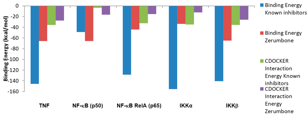 Binding energy was calculated for all docked structures with in-situ minimization of the ligand. Analysis of the binding energy showed that all reported inhibitor molecules had higher binding energies as compared with zerumbone. The results showed clearly that zerumbone had higher affinity towards cytoplasmic proteins such as NF-κB component p50 and IKKβ.