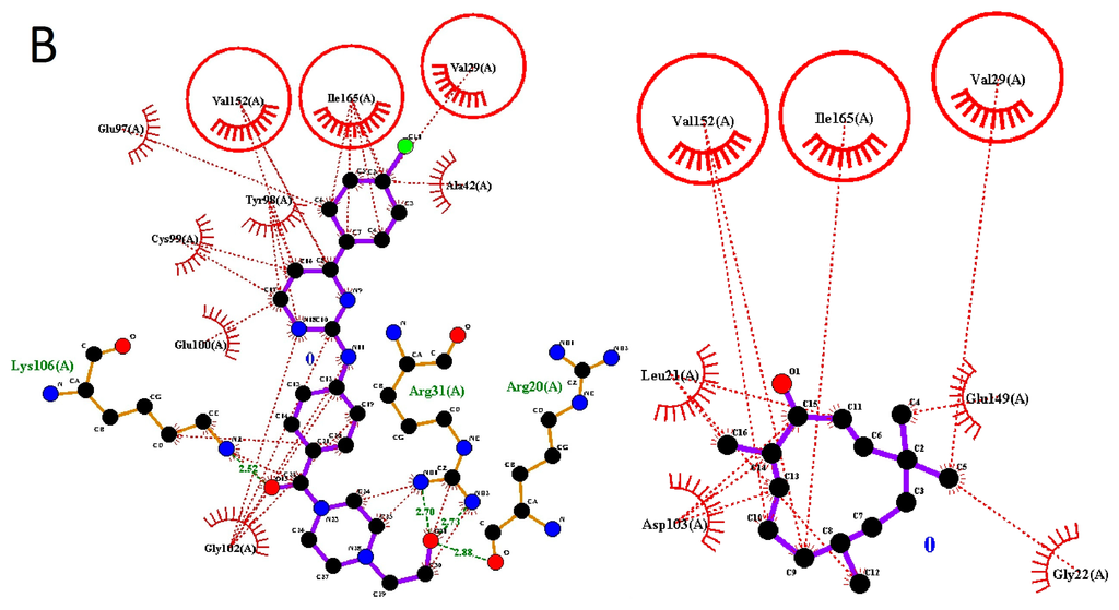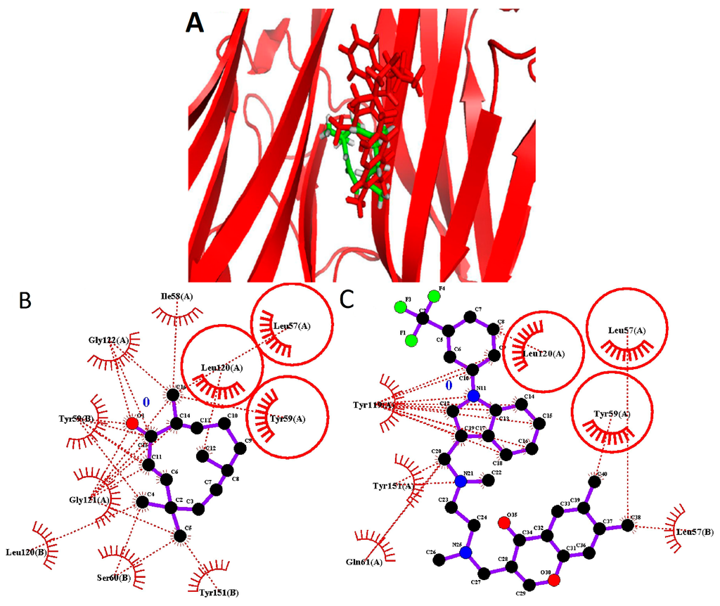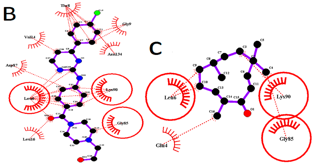 Zerumbone and the known inhibitor binding to Tumor Necrosis Factor α. (A) Zerumbone (green) binding to Tumor Necrosis Factor α is presented. The known ligand (red) and zerumbone bind into the same active pocket; (B) two dimensional protein-lilgand interactions plot (LIGPLOT) of zerumbone in the active site of the protein; (C) LIGPLOT of known inhibitor in the active site of the protein. The common residues are circled.