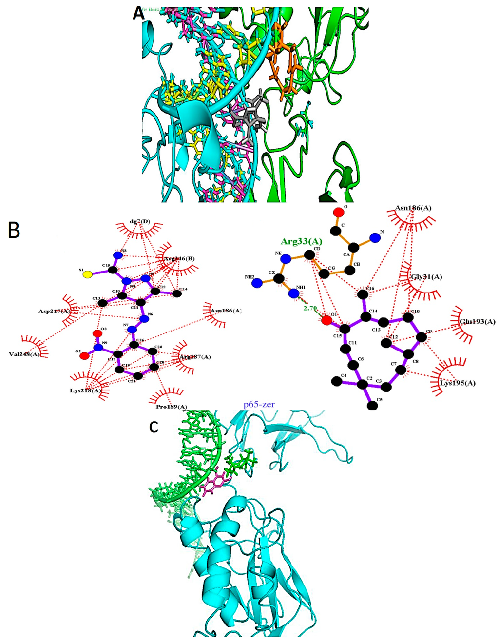 Takada et al. [15] had shown earlier that zerumbone pretreatment inhibits the NF-κB complex indirectly in a time dependent and concentration dependent manner at concentrations of 50 micromoles. Our results appear consistent with their findings because in our case also when no docking poses are obtained for the p65-DNA bound complex. However, in the absence of the DNA, when the p65 has not yet located to the nucleus, zerumbone can bind to it. They also suggest that the pre-treated cells do not induce gene expression. Hence combining all results, we can hypothesize that once zerumbone binds to the p65 component and it translocates to the nucleus, a strong binding to the DNA is prevented hence gene expression is decreased and prevented altogether in a time dependent manner.