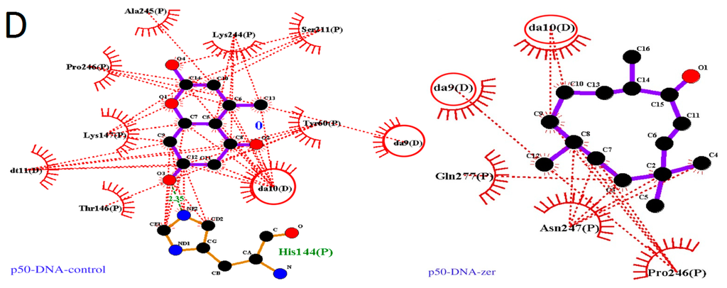 A docking experiment with p50 component of the NF-κB bound to DNA (1SVC) was also conducted. Figure 4c,d shows the results. Both the inhibitor as well as zerumbone was able to dock into a pocket near the major groove of the DNA chain. The inhibitor was embedded deeper than zerumbone. The LIGPLOT results indicated that the binding residues common to both involved Pro246, Asn247 and Gln277 and two adenine residues of the DNA. These were also the residues in the binding pocket of zerumbone. The inhibitor had a hydrogen bond with His144 and other residues comprised of Tyr60, Thr146, Lys147, Ser 211, Lys244, Ala245 and Pro 246. According to Chen et al. [36] the DNA binding site residues of the p50 subunit comprised of 56, 58, 59, 61, 62, 65–68, 143, 145, 146, 243, 274, 276, 307 and 308. Comparing our results of the binding pocket, we observed that most of the residues of the binding pocket of the control inhibitor, except for Thr146, were adjacent to the suggested residues. The results are consistent with those obtained by Piccagli et al. [35] who propose a similar binding pocket in the murine p50 subunit of NF-κB. For zerumbone all binding residues were adjacent to the actual residues [35]. The binding energy obtained for the zerumbone-p50-DNA complex was −65.66 kcal/mol, which was surprisingly higher than the coumarin derivative with −48.81 kcal/mol. These results also indicated affinity of zerumbone for NF-κB complex inhibition. As shown by the experimental results of Takada et al [15], zerumbone was able to bind to the p65 and the p50 component of the complex with some affinity. However, they suggested that zerumbone is essentially able to inhibit a step upstream that leads to the activation of NF-κB [14]. Experimental data in our lab [38] also showed that NF-κB gene expression was downregulated in breast cancer cells in the presence of zerumbone with a mean intensity ratio of 0.53. This means that zerumbone probably affects gene expression of the proteins rather than inhibiting the actual protein.