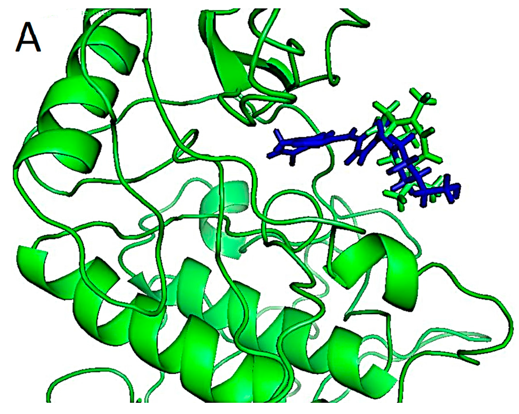 The alignment showed the identical KD residues between the template xIKKβ and the model hIKKα with asterix below them. From the alignment, it could be seen that the kinase domain (KD) of the two proteins were almost superimposed. The RMSD value estimated using Swiss-PDB Viewer of the model hIKKα from the template is 0.47 Å [47]. The modeled structure of the catalytic site of the protein is presented in Figure 6c.