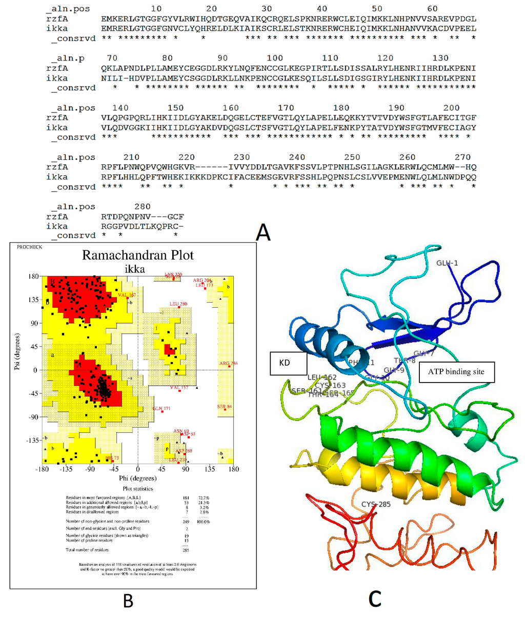 The predicted structure of hIKKα. (A) The Modeller9.12 generated alignment of catalytic region of IKKα and IKKα. Residues that are common among both protein sequences are labelled as * below each residue column; (B) Ramachandran plot for the predicted protein; (C) The complete model of the predicted structure.