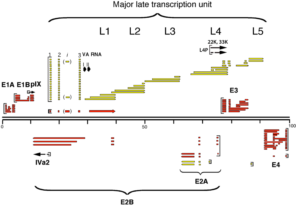 Schematic representation of the Ad5 genome and the expressed viral transcripts. The early transcripts are shown in red and the late ones are marked in yellow. Intermediate genes are indicated as black arrows.